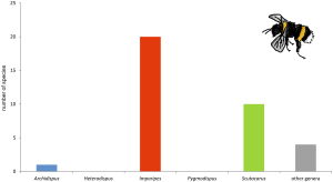 In the superfamily Apoidea, scutacarid mites occur together with Apidae, Andrenidae, Colletidae, Crabronidae, Halictidae and Sphecidae (Annex IV). In fact, Scutacaridae are amongst the most frequent and diverse associates of bees (Eickwort 1994). Most of the associated scutacarids belong to the genera Imparipes, followed by Scutacarus (Figure 10).