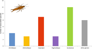Different other insect taxa beside Coleoptera and Aculeata also serve as hosts for a variety of Scutacaridae (Annex I, Figures 6, 7, 13). There are unique reports of scutacarid species found on earworms (Dermaptera) and on bugs (Heteroptera), respectively (Trägårdh 1905, Paoli 1911, Khaustov 2008). The mite species reported from earworms is Imparipes histricinus, which is a pronounced generalist and which has been reported from ants and beetles, from mammals’ nests and from soil (Table 2). As will be discussed below, I. histricinus might in fact be a cryptic species complex. On the other hand, the scutacarid associated with the heteropteran family Reduviidae, Imparipes nikitensis Khaustov, 2005, has not been reported from any other host (Khaustov 2008).
