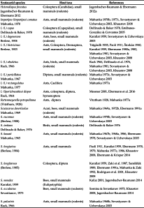 All of the scutacarids associated with mammals except the African H. foveatus and the Mexican I. cupes have been reported from the Holarctic. Unidentified scutacarids have also been reported from mammal carrion (Early and Goff 1986) and scutacarid mites can frequently be found in mammal dung (e.g. Mahunka 1964b, Truck 2012). It would have exceeded the scope of the present review to include all of these dung inhabiting species as, in contrast to scutacarids in bird’s faeces, there is a high number of them and as they cannot be regarded as real associates of mammals.