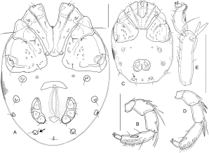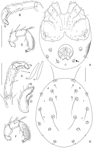 Deutonymph (n= 3; palp: n = 1) — Idiosoma L/W 300-370/220-300, venter: Fig. 2C; coxal field L/W 155-170/205-240, coxae in 3 groups, Cx-I+II mL 40-55, lL 100-115, W 145-160. I-L-5/6: Fig. 2E; I-L-5 dL/vL 86-89/75-78, ratio 1.1; HA 23, HB 26-29, HC 27-29, ratio dL/HB 3.1-3.3; S-1 L/W 34-35/5-6, ratio 5.8-6.8; S-2 L/W 38-40/6-7, ratio 5.7-6.3; distance S-1-2, 3, L ratio S-1/-2, 0.9; I-L-6 dL 53-54, HA 21, HB 15, HC 12; ratio dL/HB 3.5-3.6; dL ratio I-L-5/6, 1.6-1.7. Genital field L/W 45/66-67; maximum diameter Ac-1, 15-19; Ac-2, 18. Gnathosoma L 63-67; Palp: Fig. 2D; total L 155; L/H (ratio, rel. L [%]) P-1, 16/12 (1.3, 10); P-2, 35/22 (1.6, 23); P-3, 33/18 (1.8, 21); P-4, 53/17 (3.1, 34); P-5, 18/8 (2.3, 12); L ratio P-2/P-3, 1.06: P-2/P-4, 0.66; P-3/P-4, 0.62. As typical for deutonymphs, many setae are reduced and the genital field bears only two pairs of Ac. Platelets Vgl-1/2 are distinctly separate in all specimens. Proportions of L-I-5/6 are less extreme than in adults, but I-L-6 is shortened and typical in shape.