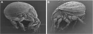 As noted, aggregation may facilitate finding mates (Block and Convey 1995) or deposition of eggs in areas far above tidal range (Bücking et al. 1998), but there are several other reproductive traits that have evolved as adaptations to the marine environment. For example, most Ameronothridae are ovoviviparous (for a detailed discussion of this phenomenon see Norton 1994), with the larva having developed within the mother’s body and hatching from the egg immediately (larviparity) or within a few hours after deposition (Luxton 1966, Weigmann 1975a, Bücking et al. 1998, Søvik 2003, Søvik et al. 2003). This way, the vulnerable egg stage is extremely shortened and the mobile larva can promptly escape tidal waves. The tropical Fortuyniidae and Selenoribatidae, on the other hand, are oviparous; their egg stage takes approximately 15–35 days, similar to those of typical terrestrial oribatid mites (Pfingstl 2013a). However, they protect their eggs from tidal movement by either gluing them into tiny crevices of the substrate, as for example in F. atlantica, or they push them deep into the intertidal algae so that the algal mass completely encloses and protects the eggs, e.g. as in A. inexpectatus (Pfingstl 2013a).arSpermatophores of males appear even more fragile structures that are easily destroyed by the mechanical effects of the tides, but no special littoral adaptations are known, which Alberti (1974) already demonstrated for Trombidiformes. Typical stalked spermatophores were found in Ameronothridae (Luxton 1966, Schuster 1979, Søvik 2004), Fortuyniidae and Selenoribatidae (Pfingstl 2013a). Pfingstl (2013a) suggested that spermatophore deposition, detection and utilization by females may happen quickly during the short time frame of low tide. In this way spermatophores would not come in contact with water and hence would be safe. arDistinct sexual dimorphism is present in a small percentage of ameronothroid species, where it is expressed to different degrees and in various regions of the body (Pfingstl 2015a, Behan-Pelletier and Eamer 2010, Behan-Pelletier 2015) (Figure 7). In A. lineatus and A. nigrofemoratus, males exhibit conspicuously longer legs than females (e.g. Schubart 1975) whereas in the podacarid species Podacarus auberti, Halozetes belgicae and Alaskozetes antarcticus males show a remarkable aggenital neotrichy which is absent in females (e.g. Wallwork 1964). Not a single case of sexual dimorphism is known in selenoribatid mites, whereas a handful of fortuyniid species have elaborate sexually dimorphic characters. Fortuynia yunkeri males show only slight modifications of the fourth leg (Hammen 1963) but males of F. atlantica possess certain lanceolate notogastral setae, enlarged notogastral porose areas and a pair of obvious lateral protuberances on the notogaster (Krisper and Schuster 2008); in males of F. dimorpha the posterior part of the gastronotic region is completely covered with a porose area and several notogastral setae are conspicuously elongated (Pfingstl 2015a). The function of these modified characters is unknown but if they are linked to dermal glands like the octotaxic system of brachypyline mites (Alberti et al. 1997, Norton and Alberti 1997, Norton et al. 1997) and porose areas of mixonomatid Collohmanniidae (Norton and Sidorchuk 2014), they probably play a role in semiochemical communication linked with associative mating (Pfingstl 2015a, Behan-Pelletier 2015). Although never observed, direct sperm transfer in the littoral environment would be clearly advantageous because it reduces the stress for the sperm package in this intermittently dry and wet habitat.