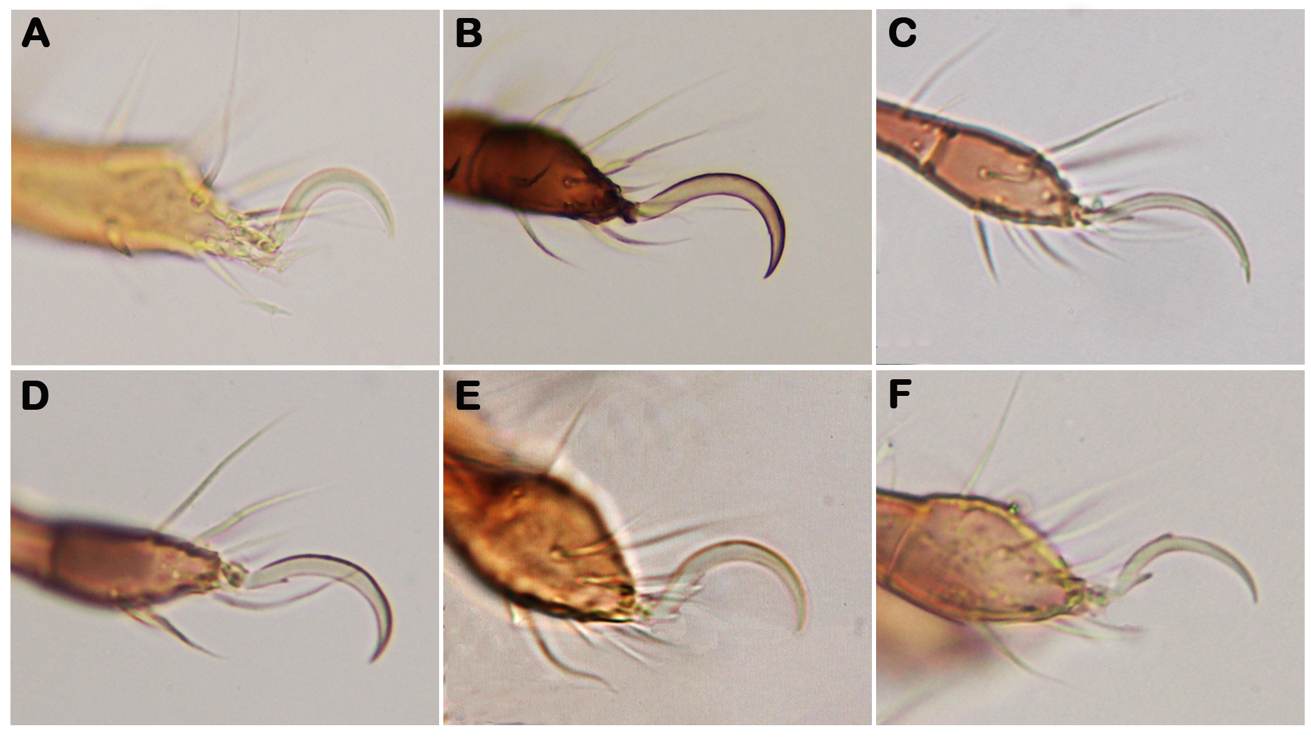 Another morphological trait affected by tidal wave action is the tarsal claws of the legs. Karasawa and Hijii (2004b) demonstrated that monodactylous species dominate in littoral environments and consequently they stated that a reduction in the number of claws may be an evolutionary adaptation to regular tidal flooding. All members of Fortuyniidae and Selenoribatidae, which are stenotopic inhabitants of the intertidal zone, show only a single claw on their legs, whereas Ameronothridae and Podacaridae, which have both intertidal and non-intertidal representatives, possess either one or three claws. Concerning the latter, Schubart (1975) noted that Ameronothrus species living on hard substrates (e.g. rocks, shore fortifications) are tridactylous, while species dwelling on soft substrates (e.g. salt meadows, silted rocks) are monodactylous, accordingly he postulated a correlation between type of substratum and claw number. Apart from the claw number, Pugh et al. (1987b) demonstrated that claws of intertidal Ameronothrus species are proportionally longer than those of congeneric supralittoral species. Indeed, the majority of intertidal oribatid species possesses elongated claws (Figure 3) allowing them to grip the substrate more tightly during tidal flooding (Karasawa and Hijii 2004b); these claws may be equipped with spine-like structures (Figures 3D–F), as in most selenoribatid species (e.g. Strenzke 1961, Grandjean 1968, Pfingstl 2013c, 2015b).