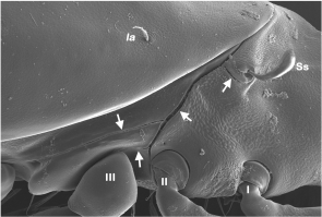 Intertidal ameronothroid mites are air-breathing animals respiring with a tracheal system, therefore they had to evolve special adaptations in order to survive daily tidal flooding. Ameronothroid mites are known to use plastron respiration when flooded. A plastron is an alternative respiration system absorbing oxygen from the surrounding water via a thin layer of air trapped by hydrophobic hairs or other cuticular projections (definition after Fielden et al. 2011) and is known to occur in many aquatic and semi-aquatic arthropod taxa, like insects and spiders. Plastrons of intertidal ameronothroid mites (Figure 4) are associated with cuticular and/or cerotegumental structures (e.g. Pugh et al. 1987a, 1990; Messner et al. 1992, Pfingstl and Krisper 2014). It was demonstrated by Pugh et al. (1987a) that the cerotegument of Ameronothrus marinus contains approximately 21 % airspace and that of A. maculatus even 60%. Although the air-retaining surface structures are more or less similar in all investigated taxa, the specific mode of plastron respiration differs considerably among them. For example, in flooded fortuyniid and selenoribatid adults the retained layer of air always communicates with the tracheal system (Pfingstl and Krisper 2014), whereas in submerged Ameronothrus individuals no such connection was found, and diffusion of oxygen from the plastron is assumed to occur across the weakly sclerotized cuticle instead via the tracheae (Pugh et al. 1987b, 1990). Similarly, in juvenile Fortuyniidae and Selenoribatidae air is retained in certain large lateral and ventral folds of the soft integument, and these folds are equipped with series of pores leading into tracheal structures supplying the internal organs with oxygen (Pfingstl and Krisper 2014). In Ameronothrus nymphs, on the other hand, the folding pattern is conspicuously different, tracheal structures are absent and gas transfer is assumed to take place across the whole soft integument (Messner et al. 1992).