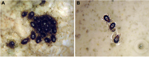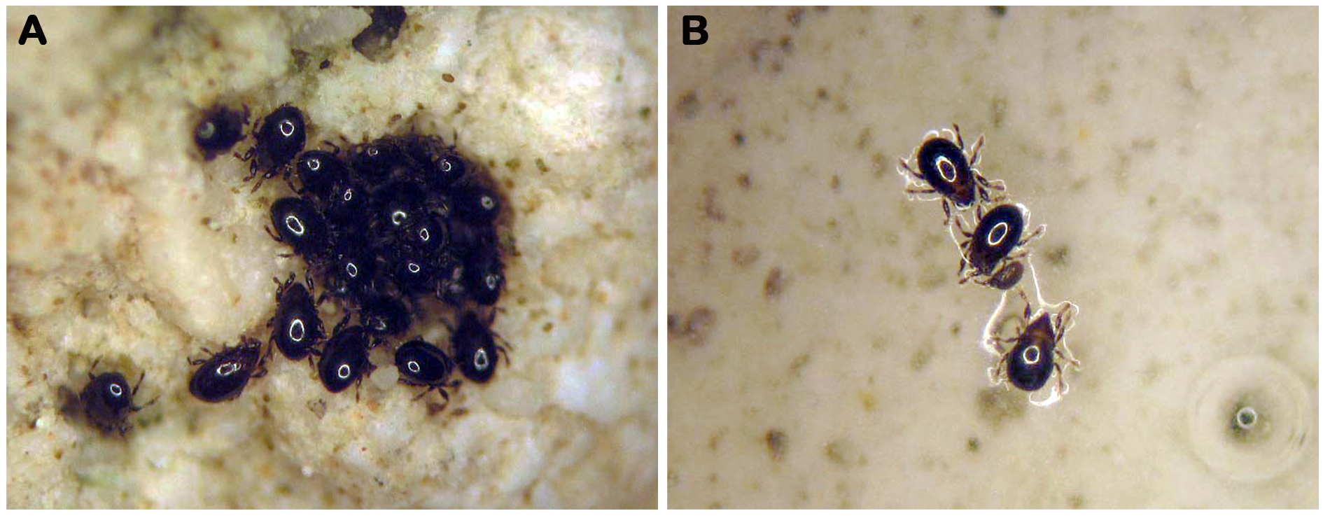 Intertidal mites are confined to a relatively few microhabitats, such as rocky shore lichens, kelp holdfasts, etc., which provide protection from direct and indirect stresses of severe wave action (Pugh and Mercer 2001), but behavioural adaptations further minimize these stresses. Several marine-associated oribatid mites are relatively quick and active climbers (Pfingstl 2013a); this allows them to escape rising tide and retreat into crevices or other protected spots. There may be a relation among the speed of this locomotion, the substrate and the mite’s vertical occurrence in the littoral area (Pfingstl 2013a). Species dwelling on rocky exposed substrate in the lower eulittoral, such as F. atlantica, are very fast climbers (Pfingstl 2013a), while species living in the upper and more vegetated eulittoral area, e.g. Halozetes otagoensis, Ameronothrus schneideri and Alaskozetes antarcticus, are moderate or even sluggish runners (Luxton 1966, 1990a, Strong 1967, Goddard 1979). The more exposed and closer the animals are to the water’s edge, the more quickly they must react and move to avoid being washed away. arAnother behavioural strategy to prevent dislodgement by waves is aggregation. This has been observed often and in many intertidal taxa, e.g. Fortuyniidae (Krisper and Schuster 2008, Pfingstl 2013a), Ameronothridae (Schulte et al. 1975, Schulte 1976b, Bücking et al. 1998, Søvik 2004) and Podacaridae, (Peckham 1967, Goddard 1979, Convey 1994b) where hundreds of individuals of different age are crouched next to and on top of each other (Figure 6A). Protection against wave action is a primary function of this behaviour, but in some instances aggregations may aid mate location (Block and Convey 1995) and synchronization of moults (Søvik 2004).