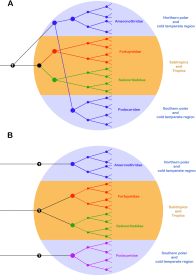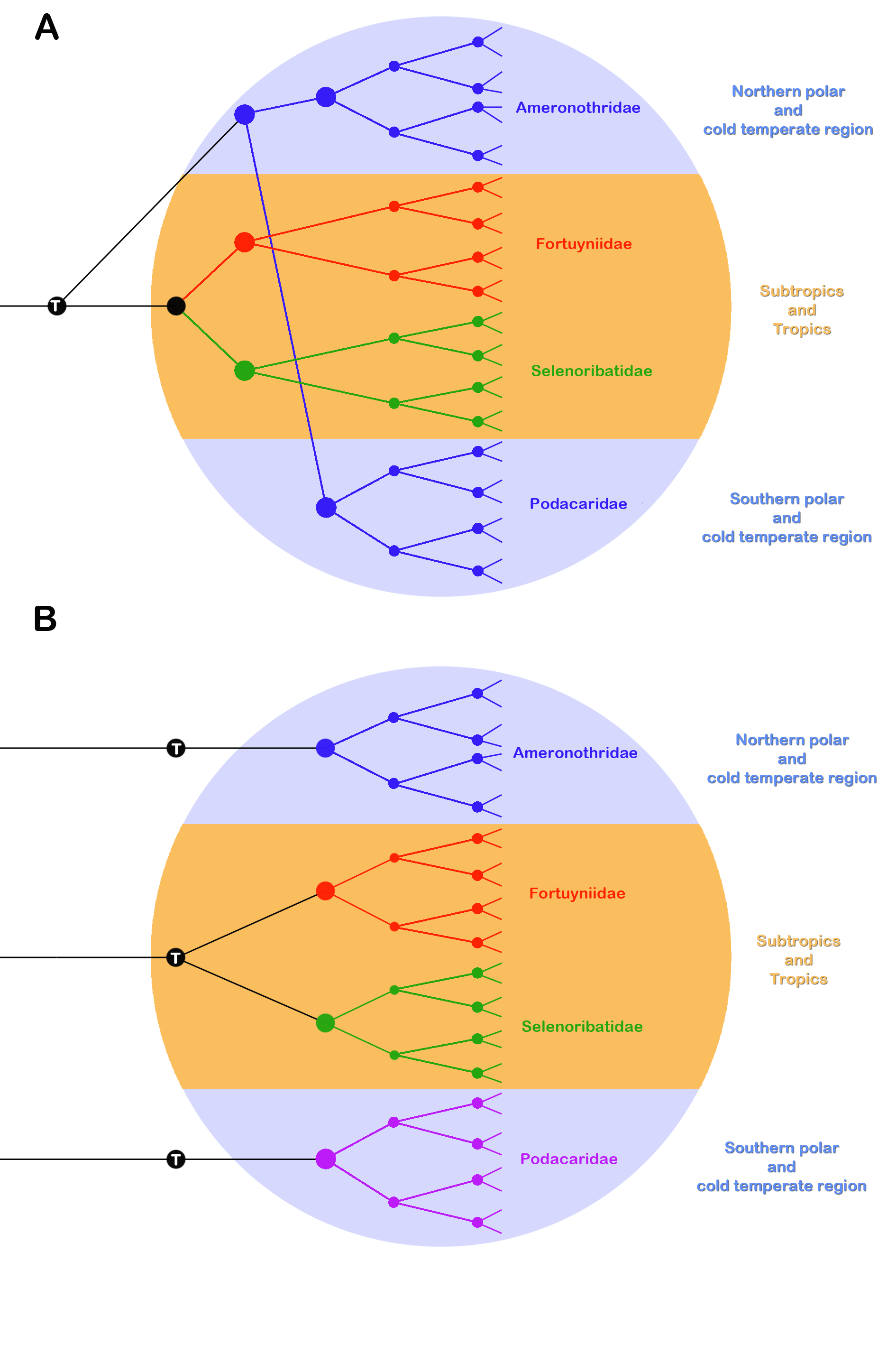 Procheş (2001), on the other hand, suggested that land-to-sea transition in secondary marine organisms, including ameronothroid mites, took place independently in three distinct latitudinal bands (northern cold-temperate, tropical, southern cold-temperate) (Figure 9B). He suggested that species interactions, i.e. competition, drove the origin of marine association in subtropical and tropical selenoribatid and fortuyniid mites, while glaciation is thought to be responsible for that of polar ameronothrid/podacarid mites (e.g. Schulte and Weigmann 1977, Procheş and Marshall 2001).