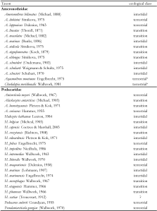 Ameronothroid mites have colonized various microhabitats of the marine littoral, even though this represents only a spatially restricted habitat. Ameronothridae and Podacaridae show various degrees of association with the intertidal ecosystem, including (1) typical intertidal species, e.g. A. marinus; (2) so-called transition species, able to dwell in both environments, e.g. A. lineatus; and (3) typical terrestrial species, as for example P. auberti (Schulte and Weigmann 1977) (see Table 2). There is a distinct latitudinal component to this habitat specificity: species at lower latitudes in each hemisphere are restricted to littoral environments while species found at higher latitudes show a greater affinity for terrestrial habitats (Schulte et al. 1975, Marshall and Convey 2004). Furthermore, several northern hemisphere Ameronothridae are also able to colonize brackish and freshwater habitats, such as marine ponds and estuaries (e.g. Schulte et al. 1975). Especially A. maculatus shows high freshwater tolerance and can frequently be found on the shores of coastal rivers (e.g. Schulte et al. 1975, Schuster 1986); in one case individuals were found in a small river 50 km upstream from the Mediterranean coast (Travé 1963). Some members of Ameronothridae can also be found far inland in typical terrestrial habitats, as for example the high arctic Ameronothrus lapponicus (Dalenius 1963) or the Scandinavian Ameronothrus dubinini, which was discovered a few kilometers inland (Laine et al. 1988). Within the littoral environment, Ameronothridae may occur on sediment-free rocky coasts (e.g. Bücking et al. 1998), on sediment-rich hard substrates (e.g. Schulte et al. 1975), in salt-marshes (e.g. Luxton 1966) and in washed-ashore flotsam or tidal debris (e.g. Schulte et al. 1975, Pugh and MacAlister 1994). There are also reports of quite unusual habitats. For example, the Antarctic Alaskozetes antarcticus was found near seal wallows or around penguin rookeries (Peckham 1967, Block and Convey 1995) but also on dead birds and well-rotted seal carcasses (Goddard 1979); Ameronothrus lineatus was collected from the nests of three different seabirds on Spitsbergen (Coulson et al. 2009) and Antarcticola georgiae and Halozetes belgicae were sampled from whale bones on sub-Antarctic coasts (e.g. Goddard 1979, Pugh and MacAlister 1994). Independent of microhabitat and taxon, investigations have shown that intertidal and terrestrial species show generally high niche specificity whereas transition species are eurytopic and may occur in a wide range of niches (Schulte et al. 1975, Marshall et al. 1999).