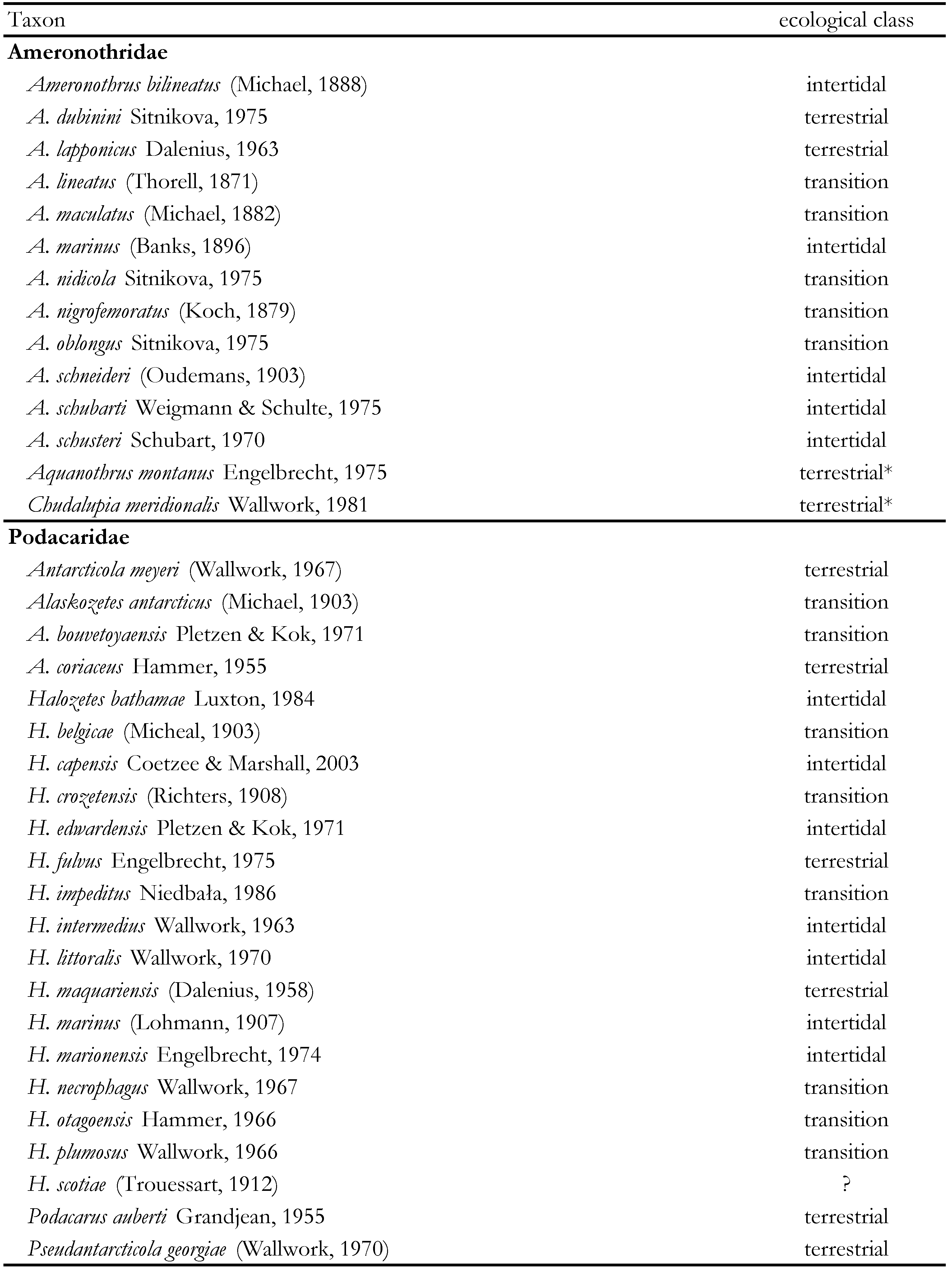 Brachypyline classification used in this text follows the broad outlines of Norton and Behan-Pelletier (2009). The term “Ameronothridae sensu stricto (s. str.)” refers to the northern hemispheric ameronothrid taxa (in the sense of Vitzthum 1942); the more inclusive term “Ameronothridae sensu lato (s. l.)” refers to this northern hemispheric component plus all southern hemispheric Podacaridae (in the sense of Wallwork 1964). These terms are only used in the Taxonomy and Systematics Section, in all other sections these groups are given as Ameronothridae and Podacaridae. A general overview of oribatid morphology is given by Norton and Behan-Pelletier (2009).arSpecies authors of all marine-associated ameronothroid mites are given in Table 2 and therefore they are not cited when they are mentioned for the first time in text. However, species authors for non-ameronothroid taxa are given in the text.