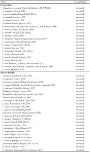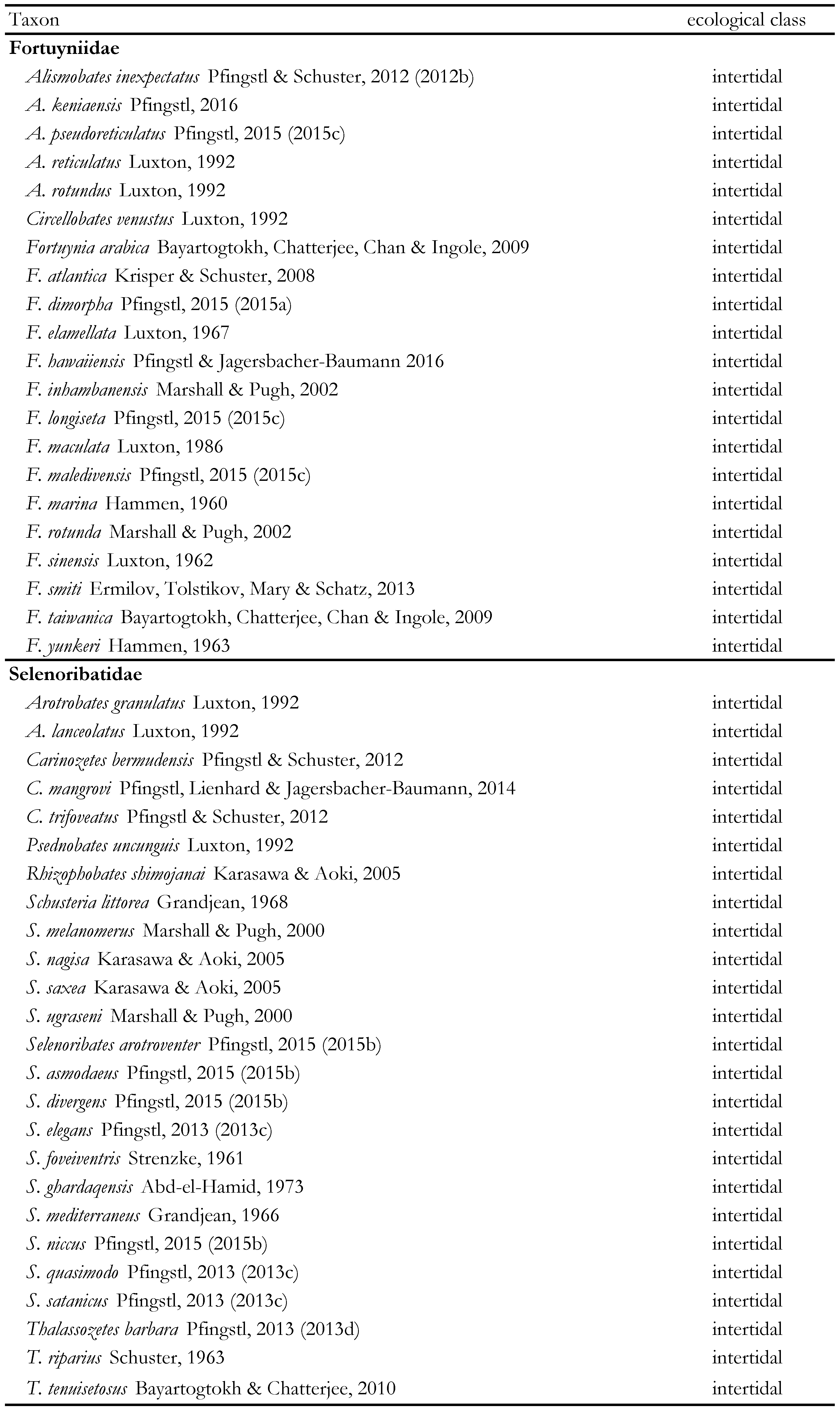 At present, different classifications of the superfamily Ameronothroidea can be found in the literature (Table 1), and several taxonomic issues are still unresolved. However, all of these classifications (e.g. Schulte and Weigmann 1977, Subías 2004, Norton and Behan-Pelletier 2009 etc.) acknowledge the Ameronothridae, Fortuyniidae and Selenoribatidae as ameronothroid families. The marine-associated lifestyle of most members of this group was surely one of the main reasons for their unification, but this motivation resulted in some ambiguous or conflicting taxonomic arrangements that are best understood in a historical context.