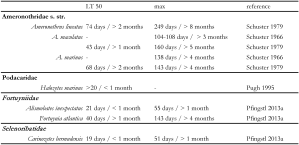 Several authors investigated the efficiency of plastron respiration in certain ameronothroid taxa and demonstrated that these mites are able to survive astonishingly long periods of time under flooded conditions (Table 3). Alismobates inexpectatus, Fortuynia atlantica and Carinozetes bermudensis specimens survived an average of one month under water (Pfingstl 2013a), A. lineatus and A. marinus specimens more than two months (Schuster 1979, Pugh et al. 1987a) and A. maculatus tolerated inundation for more than one month (Schuster 1966). Maximum survival times ranged from nearly two to eight months in these species (Schuster 1966, 1979; Pfingstl 2013b).