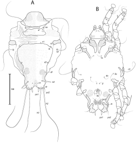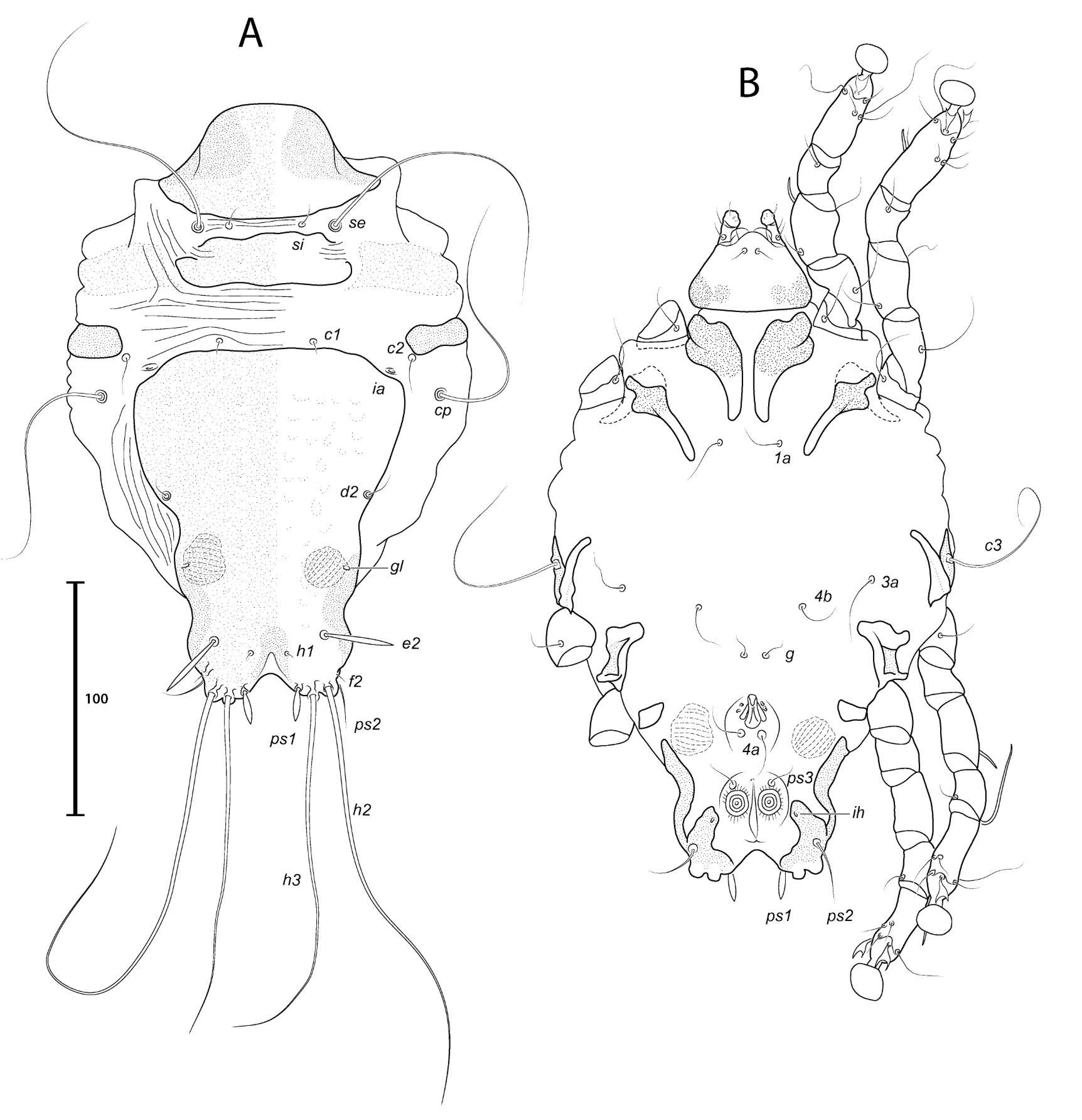 The material was collected from a specimen of Nymphicus hollandicus which died in captivity and sent to the laboratory of Acari of the Department of Zoology, Universidade Estadual Paulista, Rio Claro, São Paulo, Brazil. The bird specimen was placed in a freezer and then washed with water containing detergent; the liquid was then filtered and mites were collected with a fine brush from the filter papers under stereomicroscope, cleared in 30% lactic acid for 24 h at 50°C, and mounted in Hoyer’s medium (Krantz and Walter, 2009). After five days at 50 °C, the slides were sealed with varnish. Drawings and measuring of mites were made with a Leica DM3000 microscope equipped with differential interference contrast (DIC) optics and a camera lucida. Pencil sketches were scanned at 300 dpi and grayscale mode; line drawings were created with Adobe Illustrator CS6 and a Wacom Bamboo Create tablet. The idiosomal and leg chaetotaxies follow Griffiths et al. (1990) and Atyeo and Gaud (1966), respectively, with corrections for coxal setae proposed by Norton (1998). Type specimens are deposited at DZUnesp-RC — Collection of Acari of Department of Zoology of the Universidade Estadual Paulista, Rio Claro, São Paulo, Brazil.