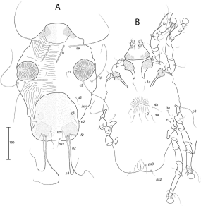 Epimerites I, II with inflated and heavily sclerotized bases, epimerites I free. Genital apparatus 15 (14–16) × 11 (9–12), aedeagus slightly shorter than genital arch. Setae 4a at base of genital arch. Setae 4b anterior to level of inner tips of epimerites IIIb. Adanal shields absent. Opisthoventral shields large, with projection towards anal suckers, carrying cupules ih and bases of setae ps2 (Fig. 2B). Ventral measurements: 4b-3a 10 (7–10), 3a-g 31 (29–38), g-4a 34 (28–34), 4a-ps3 22 (22–24), ps3-ps3 18 (15–19).