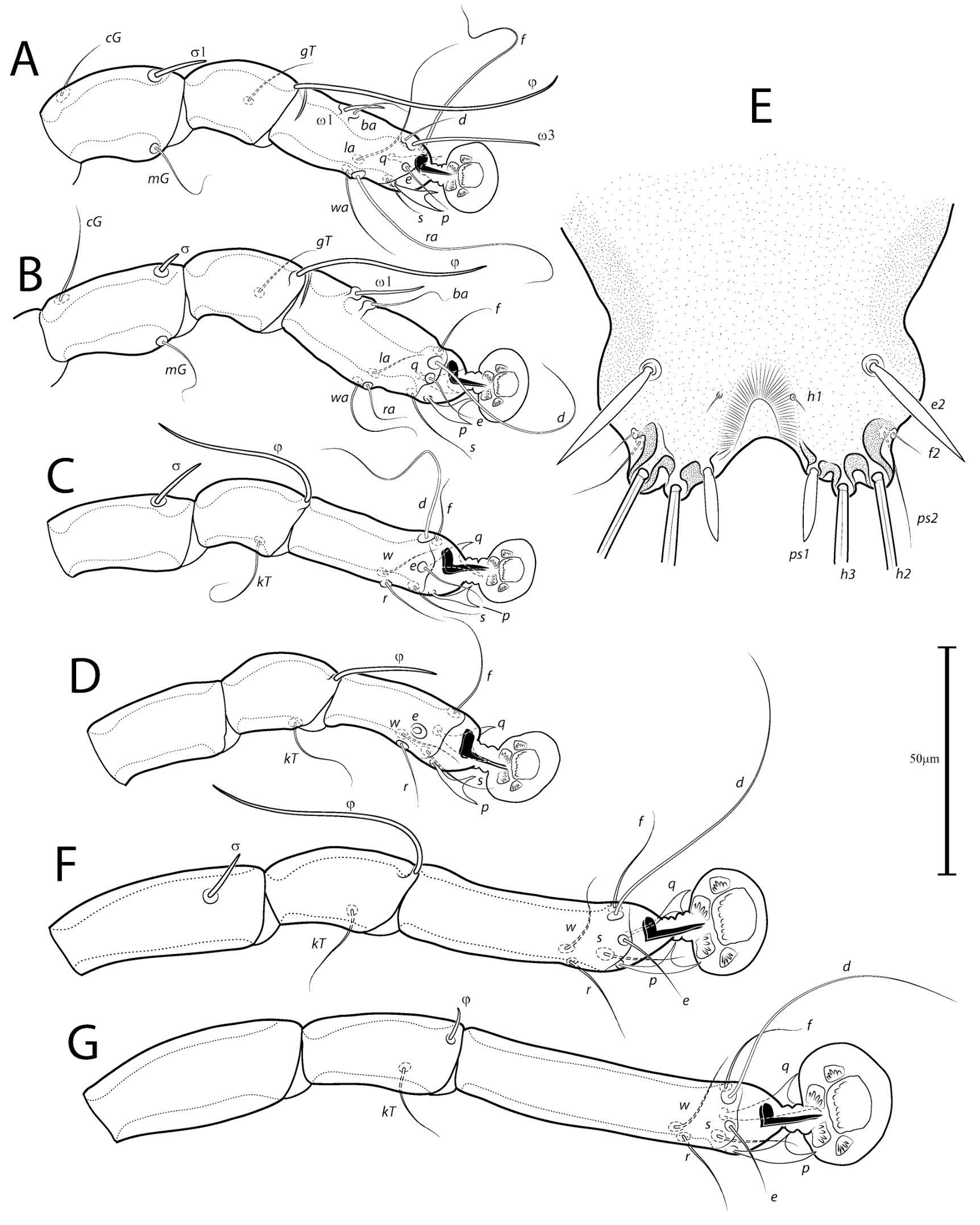 Differential diagnosis — The new species is morphologically close to P. lacunosus Dabert, Badek & Skoracki, 2007 in having, in males, setae e2 thick spiculiform, and the hysterosomal shield reaching to or close to the level of setae c1. Psittophagus hollandicus n. sp. is distinguished from that species in having, in males, the dorsal shields with weak ornamentation, the prodorsal shield split transversally at the level of scapular setae and free from the scapular shields, solenidion σ of genu III about half as long as the segment (Fig. 3C), setae si, c2 filiform, and the anal suckers without indentations. Females of the new species have piliform setae d2 and e2, setae d2 being 30μm long and barely reaching the halfway to bases of piliform setae e2. In contrast, males of P. lacunosus have the dorsal shields covered with numerous rounded lacunae, the prodorsal shield entire and fused with the scapular shields, solenidion σ of genu III equal to or even longer than the segment, setae si, c2 spiculiform, and the suckers with indentations; females of P. lacunosus have setae d2 and e2 long spiculiform, the former setae are much longer ( 100μm) and distinctly surpass the bases of corresponding setae e2.
