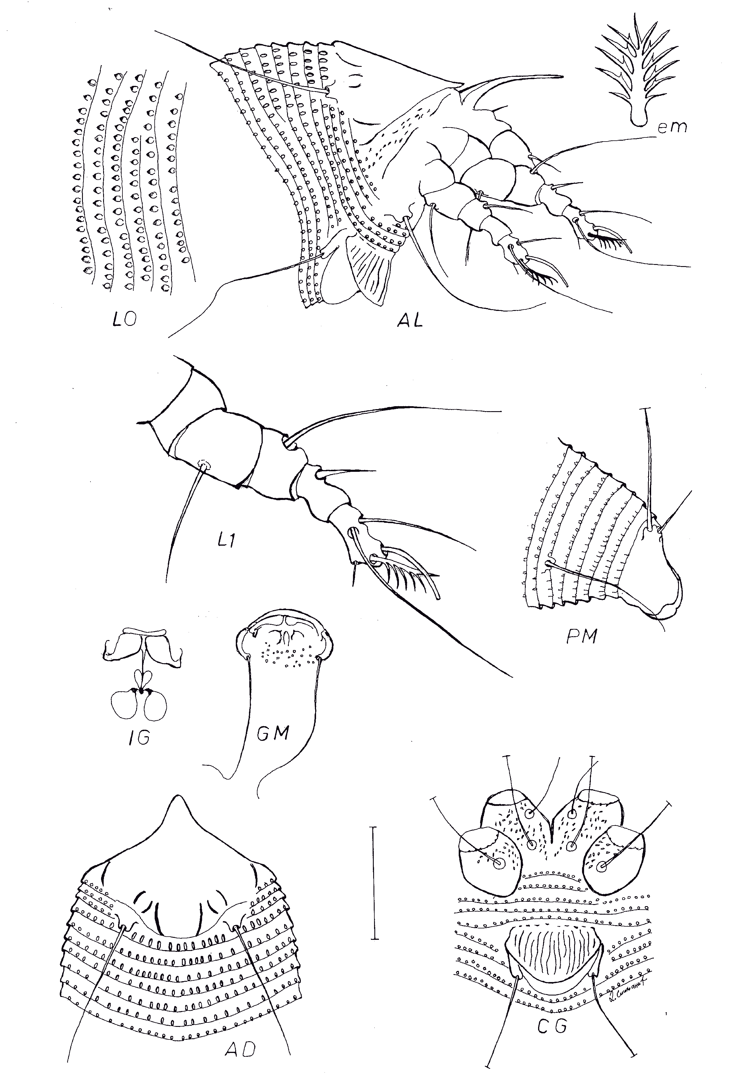 Legs — with all usual segments and setae present. Leg I 29 (25 – 32), femur 7 (6 – 9), genu 6 (5 – 7), tibia 7 (5 – 7), tarsus 8 (6 – 8), tarsal solenidion (ω) 8 (8 – 9) distally rounded, tarsal empodium (em) simple, 5 (5 – 7), 6-rayed; basiventral femoral setae (bv) 16 (12 – 16), antaxial genual setae (l′′) 21 (20 – 25), paraxial tibial setae (l′) 8 (6 – 85 (5 – 7), paraxial fastigial tarsal setae (ft′) 13 (11 – 14), antaxial fastigial tarsal setae (ft′′) 24 (21 – 28). Leg II 26 (25 – 29), femur 6 (6 – 9), genu 5 (4 – 6), tibia 5 (4 – 6), tarsus 8 (6 – 8), tarsal solenidion (ω) 8 (6 – 9) distally rounded, tarsal empodium (em) simple, 6 (4 – 6), 6-rayed; basiventral femoral setae (bv) 13 (12 – 16), antaxial genual setae (l′′) 11 (10 – 14), paraxial fastigial tarsal setae (ft′) 6 (5 – 7), antaxial fastigial tarsal setae (ft′′) 24 (20 – 28).