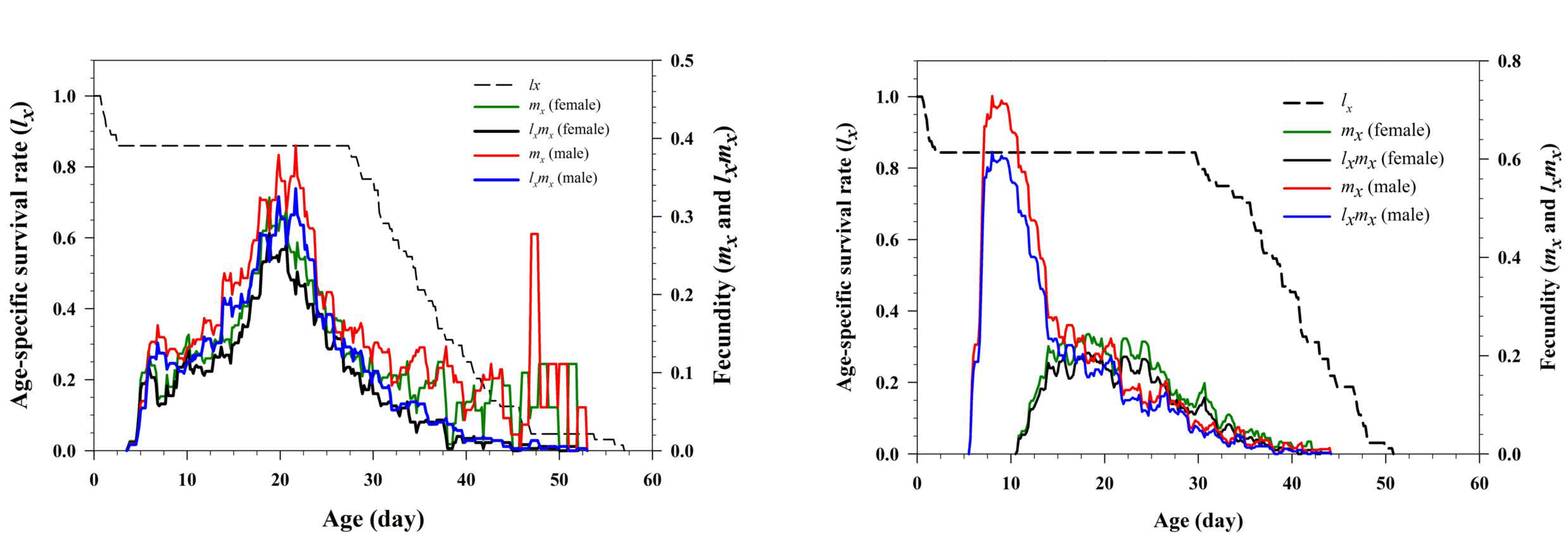 The age-stage life expectancy curves (exj ) of M. muscaedomesticae for bisexual and oedipal cohorts are plotted in Figure 3. The life expectancy of an egg was 32.1 d in the bisexual cohort, compared to 34.2 d in the oedipal cohort. After reaching adulthood, a female’s life expectancy increased to 38.8 d in the bisexual cohort and 38.2 d in the oedipal cohort.