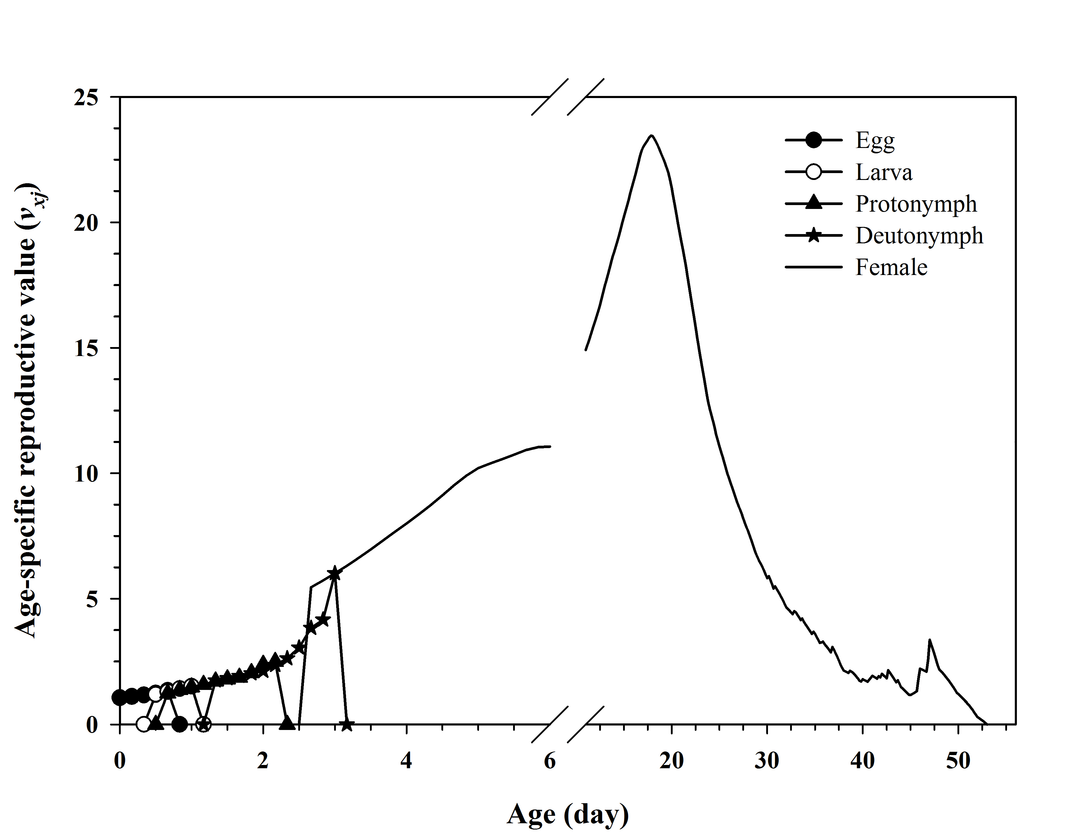 In total, 64 eggs were used at the start of the life table experiment. The development time of immature stages was recorded hourly. When the adults eclosed, virgin male and female mites were paired and kept together in rearing containers. Adult survival, longevity, and fecundity data were recorded daily until the death of all individuals. If one member of a pair died, another adult of the same sex and same age was recruited from the mass-rearing colony and paired with the surviving individual. Data relevant to the recruited individual were not included in the data analysis. The eggs laid by each female mite at different ages were kept separately under the aforementioned conditions until reaching adulthood to determine the sex of the offspring.