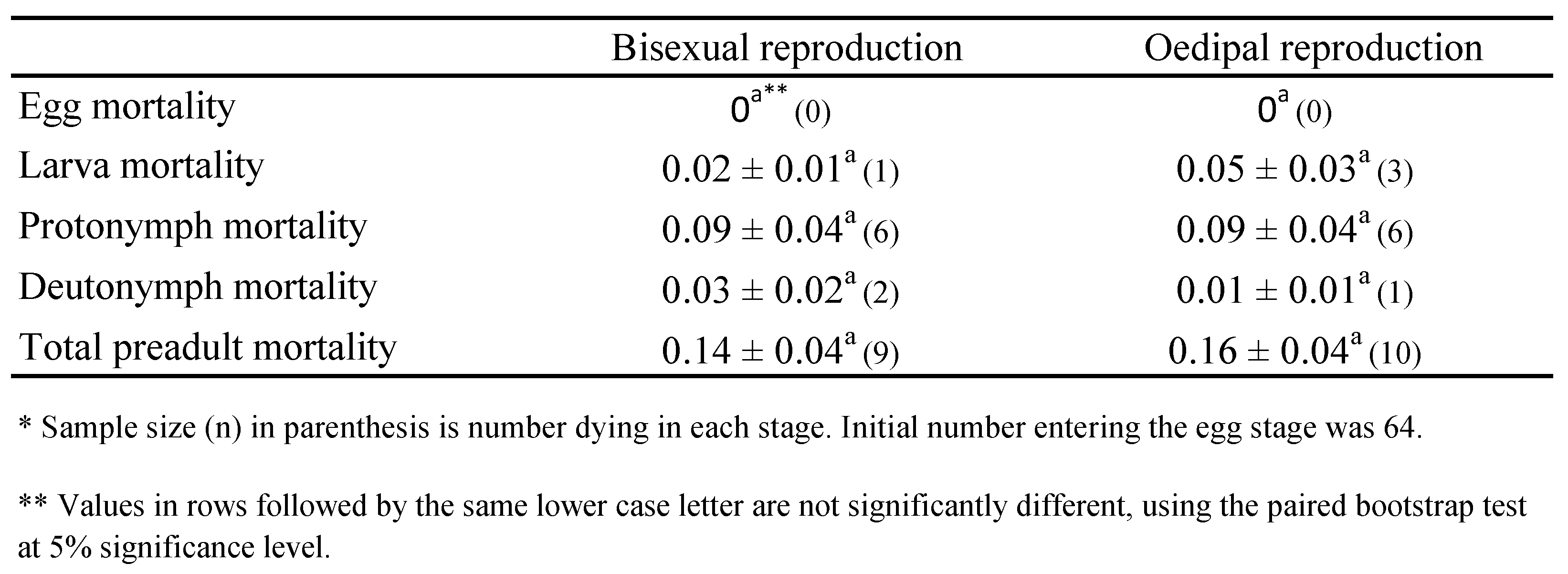 The mortality of juvenile mites ranged from 1% in oedipal reproduction to 9% in bisexual reproduction (Table 2). Most of the mortality occurred during the protonymph stage of M. muscaedomesticae. There were no significant differences between total preadult mortality in bisexual and oedipal reproducting cohorts (P = 0.80). The sex ratio in bisexual reproduction was 42% (female / total offspring).