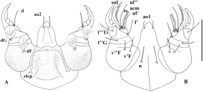 Gnathosoma (Figs. 2A-B) — Peritremes forming an inverted U, composed of eight pairs of fairly strong chambers. Dorsum of gnathosoma with pair of very small supracoxal setae elcp (measurement impossible). Venter of gnathosoma bearing subcapitular setae n 49 (48 – 50), adoral setae ao1 19 (16 – 21) and ao2 33 (30 – 36). Distance between ao1-ao1 31 (27 – 36), ao2-ao2 15 (12 – 20), n-n 48 (46 – 50). Palp setal formula as follows: trochanter without seta; femora with one fan-like (dF) and two smooth setaceous setae (v’F, v’’F); genua with one fan-like (dG) and one smooth setaceous setae (l’’G); tibiae with three smooth setaceous setae (dTi, l’Ti, l’’Ti); tibial claw strong 64 (60 – 69) long and two basal teeth; tarsi with two comb-like eupathidia (acm, sul), outer comb (sul) about as long as claw, with 13 tines distributed throughout inner surface; inner comb (acm) almost straight, with approximately 25 tines, two smooth setaceous setae (ul’, ul’’) and one solenidion (ɷ).