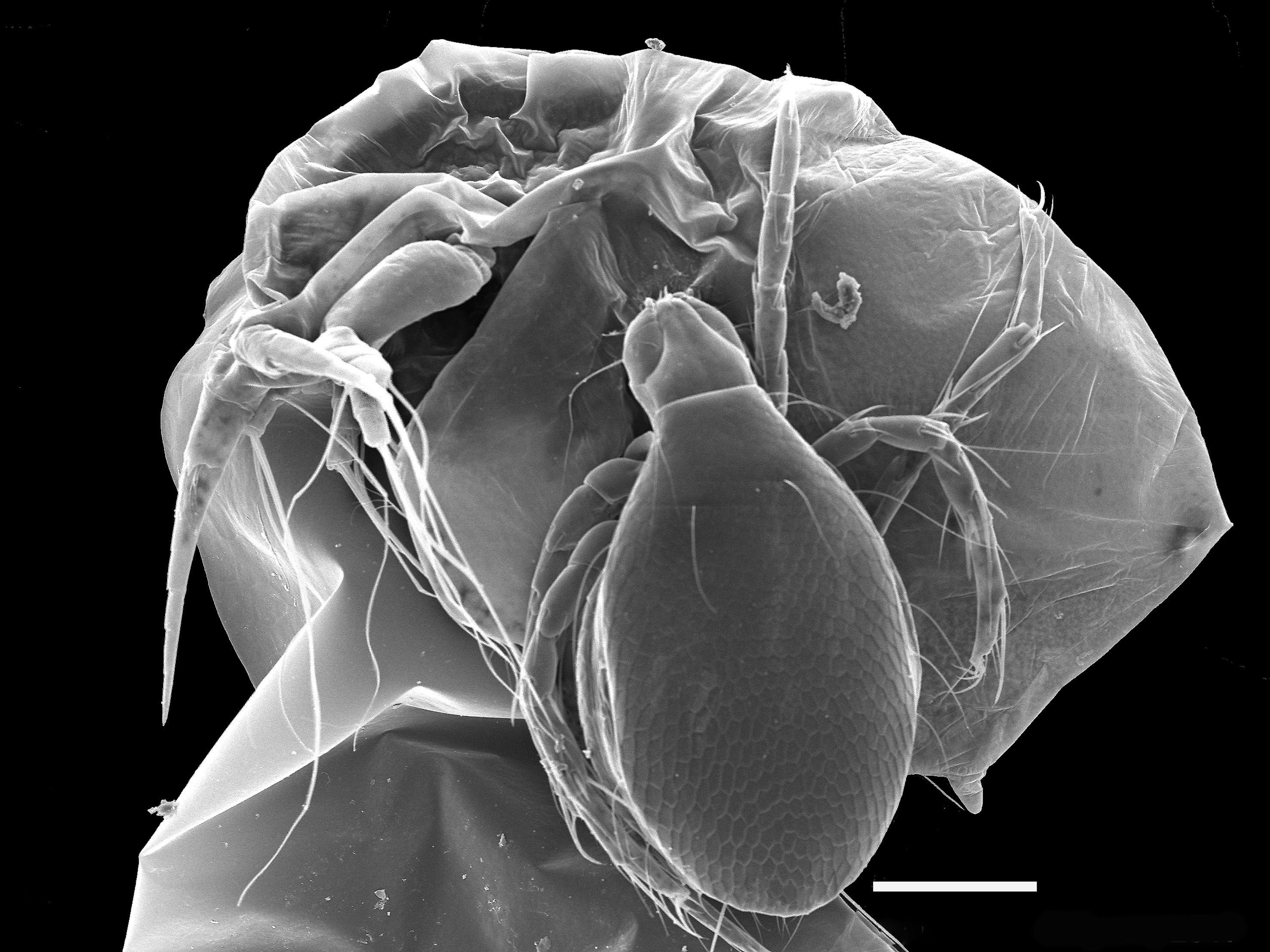 During a faunistic survey of zooplankton composition (Montes-Ortiz and Elías-Gutiérrez, 2018) in the karst sinkhole Cenote Azul (Quintana Roo, México), we found a water mite larva attached to a cladoceran. The specimens were fixed in 96% ethanol and dehydrated subsequently in an ethanol series of 30%, 40%, 50%, 60%, 70%, 80%, 90% and 100% for 15 minutes. The dehydrated sample were critical point dried and gold-coated to be observed under a Scanning Electron Microscope (JEOL-JSM6010) at 10kV (Elías-Gutiérrez et al., 2008).