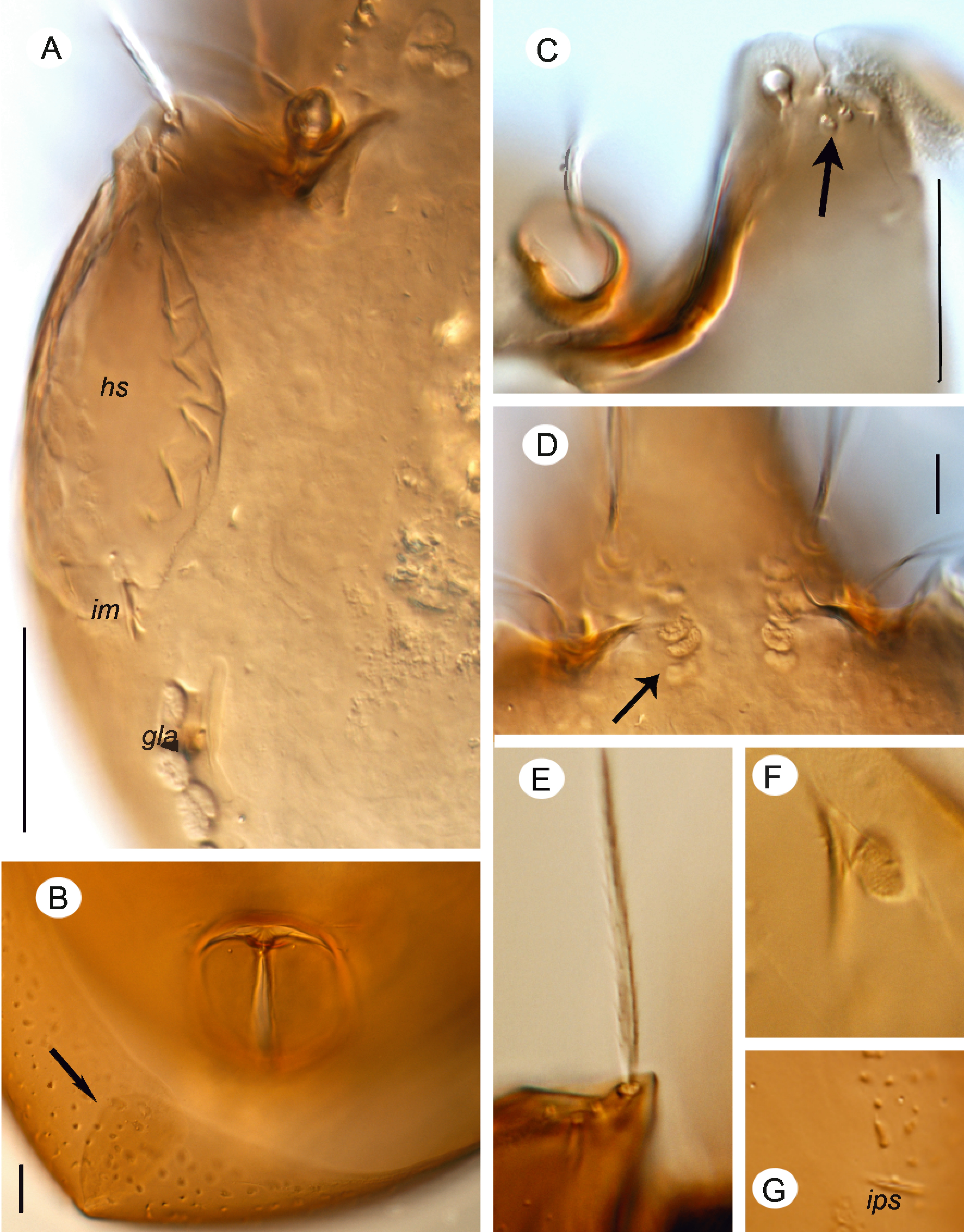 Notogaster — Humeral region rounded dorsally, with cleft (Fig. 6D) and pointed to rounded lobe ventrally (Figs 3A, 3C, 6C, 6D). Setae smooth, acuminate, 13‒17 long, except c2 52‒55 long, strongly barbed, tapered, positioned dorsally on humeral tubercle (Figs 1A, 3E, 5A, 5E). Seta lm positioned medially, in longitudinal alignment with bothridial seta (Fig. 1A). Lyrifissure ia not evident (Fig. 1A). Humeral sac about 50 long (Fig. 3A), difficult to see in preserved specimens. Lyrifissure im positioned lateral of seta lm (Figs 1A, 3A). Opening of opisthonotal gland (gla) between im and seta lp (Figs 1A, 3A).