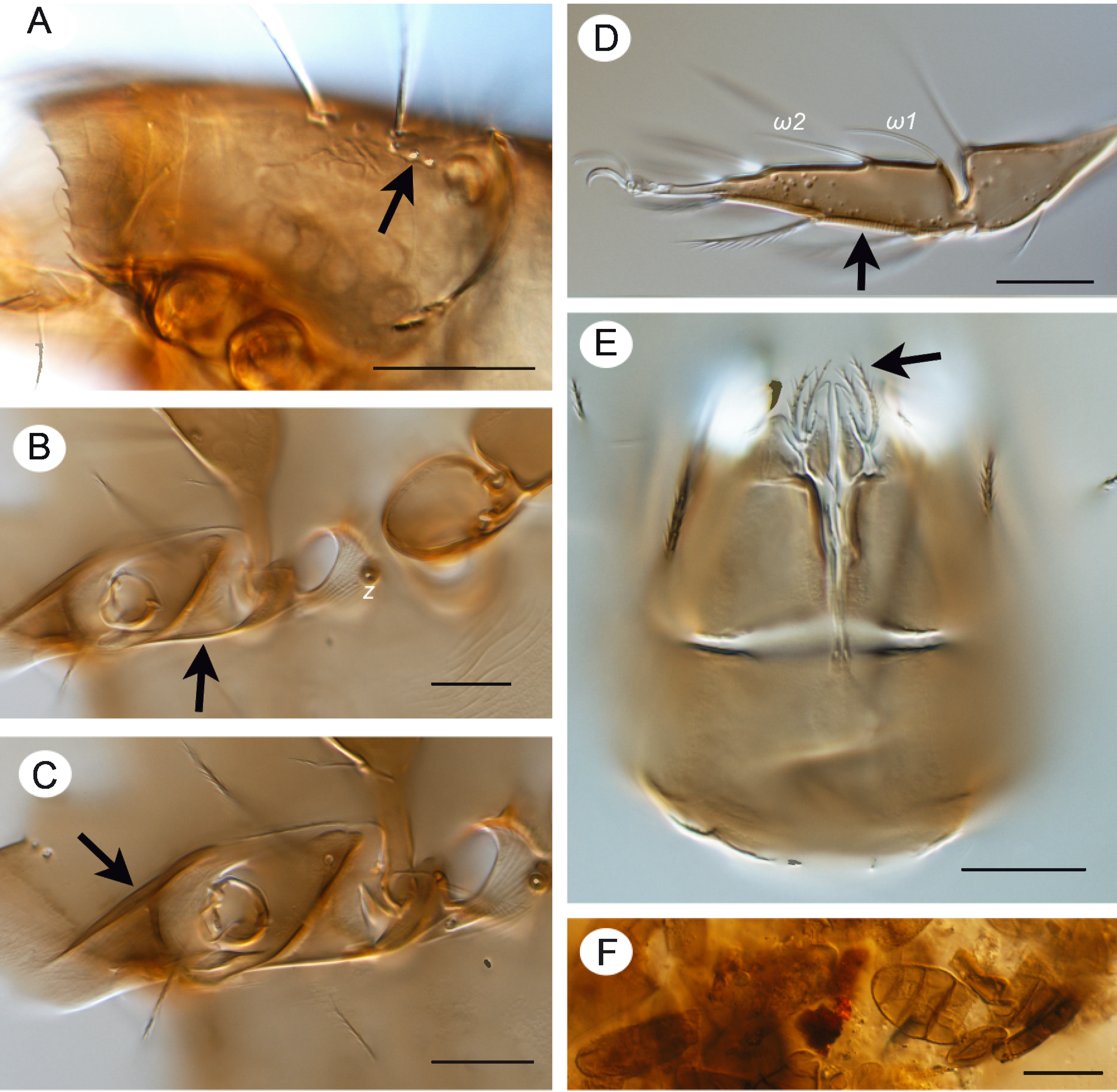 Expanded diagnosis. Adult. Small to medium sized mites, 312‒540. Integument. Surface of notogaster smooth. Cerotegument granular, present laterally on podosoma (Figs 5C, 5E). Prodorsum. Rostral margin denticulate (Figs 1A, 4A, 5D). Rostrum and region lateral to seta le with macropores (Fig. 4A). Lamella absent. Carina extending from seta in posteriorly to bothridium (Fig. 1A). Tutorium absent. Genal tooth absent. Pedotectum I uniformly curved; pedotectum II small, scaliform (Fig. 5D). Laterorostral carina extending dorsal to pedotectum I, following contour of pedotectum I, reaching anteriorly, midway to rostral margin (Fig. 5D). Bothridial seta filiform, barbed (Figs 1A, 5C). Bothridium cup-shaped (Fig. 6D). Dorsophragma absent; cheliceral retractor muscles inserting directly on prodorsal and notogastral cuticle (Figs 1A, 3D). Notogaster. Dorsosejugal scissure interrupted medially in region of insertions of cheliceral retractor muscles. Lenticulus absent. Octotaxic system expressed as macropores (Figs 1A, 6C). Posterior notogastral tectum divided or undivided; when divided, edges rounded, overlapping or not. 10 pairs of notogastral setae. Humeral region of notogaster with prominent process bearing seta c2 (Figs 1A, 3A, 6C, 6D); seta c2 longer, thicker and more barbed than other notogastral setae. Lyrifissure ia usually modified as humeral sac; lyrissure im usually unmodified, occasionally modified as pyriform organ. Lateral podosomal and epimeral region. Apodemes III and IV absent (Fig. 1B). Epimeral setal formula 3-1-3-3 or 3-1-3-2. Custodium present (Figs 4B, 5C). Discidium absent. Circumpedal carina absent. Porose areas Al, Am, Ah absent. Acetabula I‒IV in longitudinal alignment (Fig. 5C). Anogenital region. Four pairs of genital setae; one pair aggenital setae; one or two pairs of anal setae; two or three pairs of adanal setae (Figs 1B, 5B). Postanal porose area absent. Lyrifissure ian absent; lyrifissure iad oblique, positioned lateral to anterior margin of anal plate (Fig. 1B). Gnathosoma. Axillary saccule of subcapitulum absent. Palp setal formula 0-1-2-3-9(1), solenidion baculiform, appressed to palp surface, not forming double horn with eupathidium acm (Figs 1C, 6A). Chelicera chelate-dentate; setae of different forms: chb flattened, leaf-like (Figs 1D, 6A). Subcapitulum with seta h strongly directed anteriorly, setae m and a directed medially; adoral setae setose (Fig. 6B). Postpalpal seta ep spiniform. Trägårdh's organ present. Legs. Tridactylous. Leg IV not modified for jumping. Trochanters III and IV with dorsal ridge (Fig. 5C); trochanter III with outwardly curved ventral edge (Figs 5C, 5D). Femora III and IV with narrow ventral carina (Fig. 5C). Porose areas adaxially on femora I‒IV and trochanters III and IV and ventrally on tibia and tarsi I‒IV (Figs 2A‒E). Solenidion ω1 most proximal setiform structure on tarsus II, well separated from ω2 (Figs 2C, 4D).