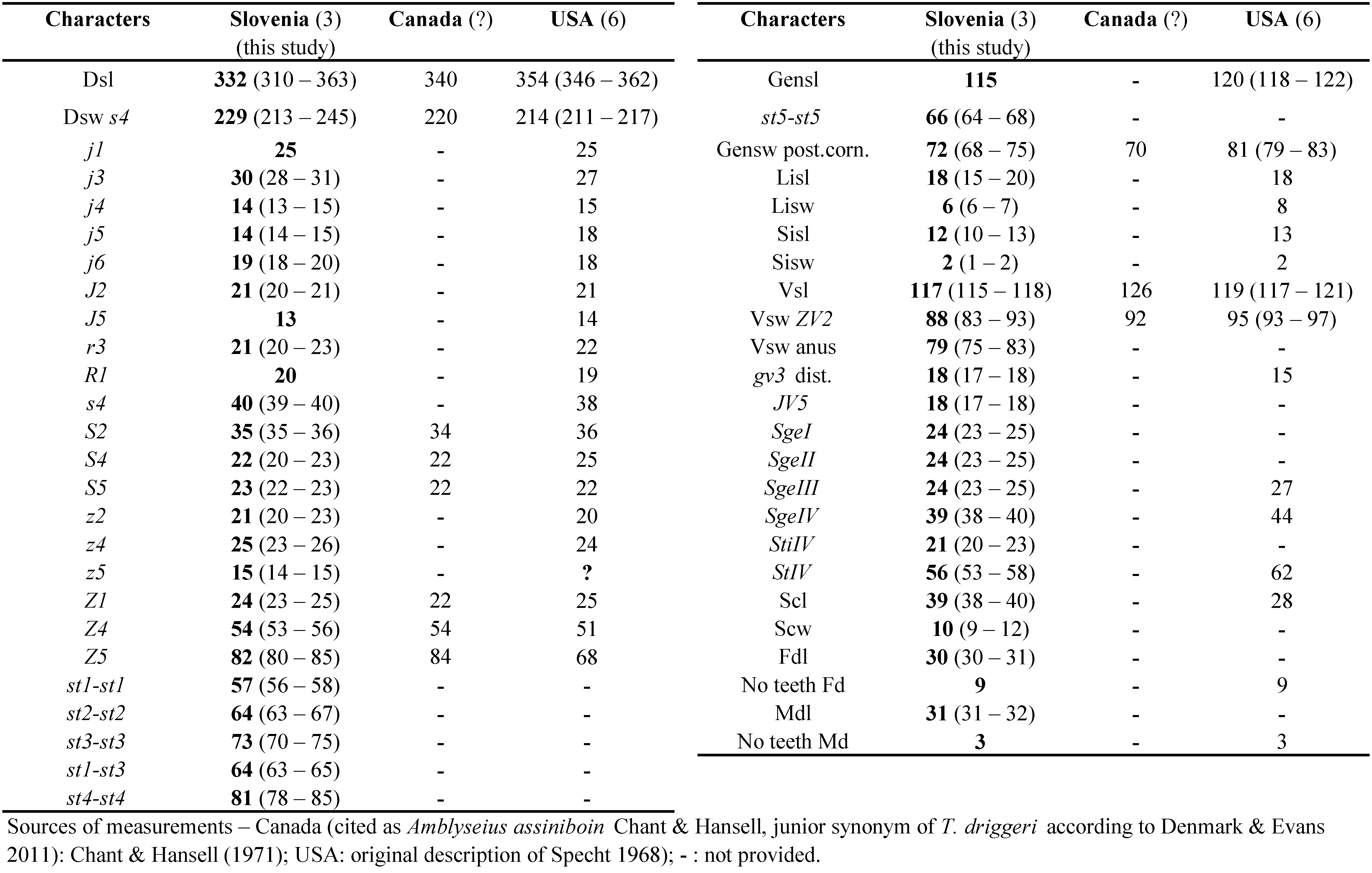 The Slovenian phytoseiid mites fauna is presently officially composed of only 14 species (Demite et al. 2020) (6 belonging to the sub-family Amblyseiinae, 1 to the Phytoseiinae and 7 to the sub-family Typhlodrominae), namely: Amblyseius andersoni (Chant), A. rademacheri Dosse, Neoseiulus cucumeris (Oudemans), N. reductus (Wainstein), Euseius finlandicus (Oudemans), Kampimodromus aberrans (Oudemans), Phytoseius macropilis (Banks), Neoseiulella tiliarum (Evans), Paraseiulus soleiger (Ribaga), P. talbii (Athias-Henriot), P. triporus (Chant and Yoshida-Shaul), Typhlodromus (Anthoseius) bakeri (Garman), T. ( A.) rhenanus (Oudemans), and T. (Typhlodromus) pyri Scheuten. In this world database, only one international paper (Bohinc and Trdan 2013) is actually indicated reporting species in Slovenia.