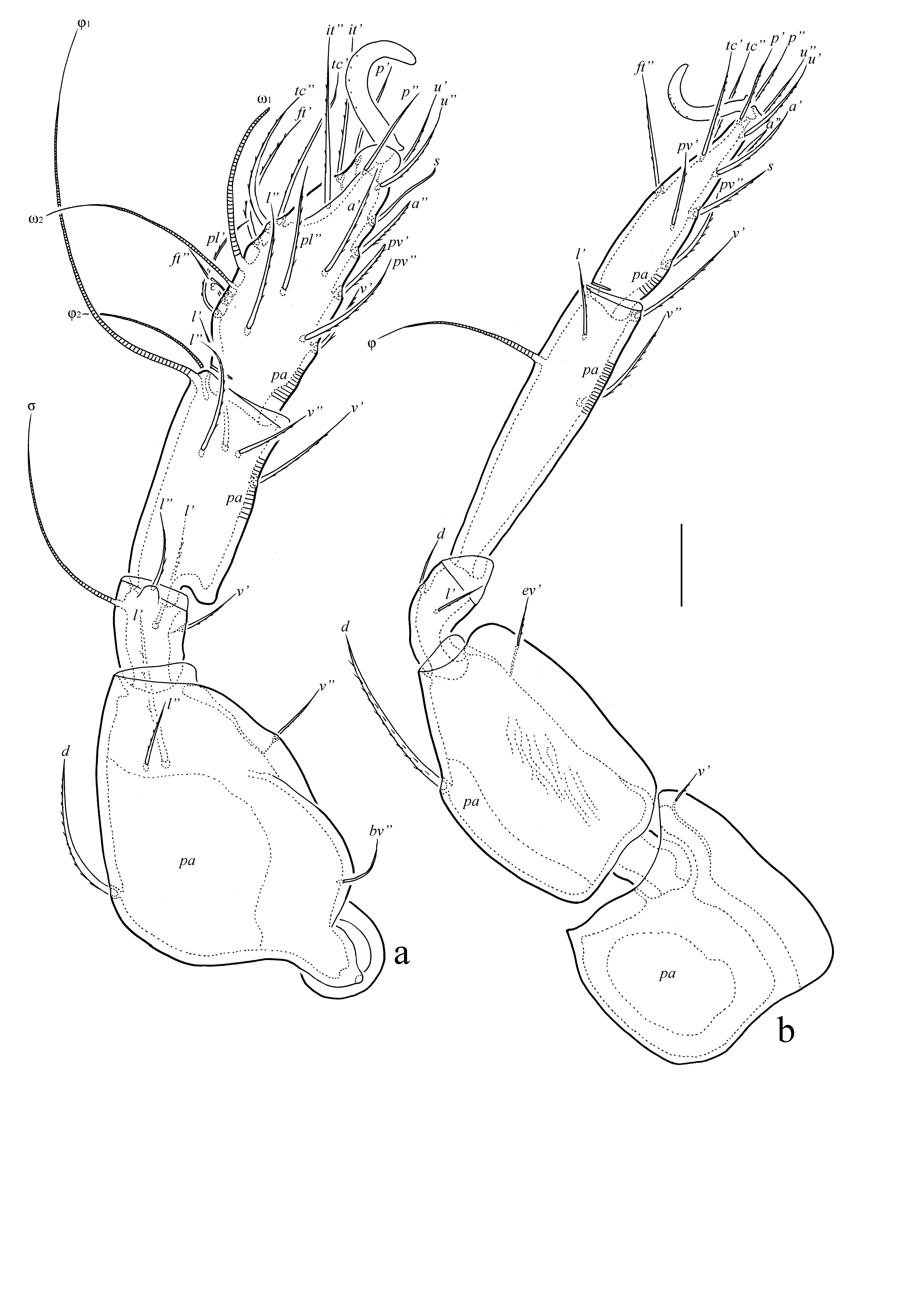 Legs (Figs 2a, 2b, 3a, 3b) – Monodactylous. Claw of all tarsi strong, slightly barbed on dorsal side, with tubercle ventrobasally. Claw of tarsi I and II thicker than that of tarsi III and IV. Tibiae I and II with tubercle proximoventrally. Femur II with broadly rounded ledge distoventrally. Trochanter IV pointed distodorsally. Dorsoparaxial porose area on all femora and on trochanters III, IV, and proximoventral porose area on all tarsi and distoventral porose area on all tibiae well visible. Formulas of leg setation and solenidia: I (1–5–3–4–20) [1–2–2], II (1–5–3–4–15) [1–1–2], III (2–3–1–3–15) [1–1–0], IV (1–2–2–3–12) [0–1–0]; homology of setae and solenidia indicated in Table 1. Famulus of tarsus I short, erect, slightly dilated distally, inserted between solenidion ω2 and seta ft''. Solenidion ω1 on tarsi I, ω1 and ω2 on tarsus II and σ on genu III bacilliform, other solenidia setiform. Seta pl' on tarsus I located dorsally on segment, posterior to seta ft''. Seta l'' on genu I inserted on tubercle.