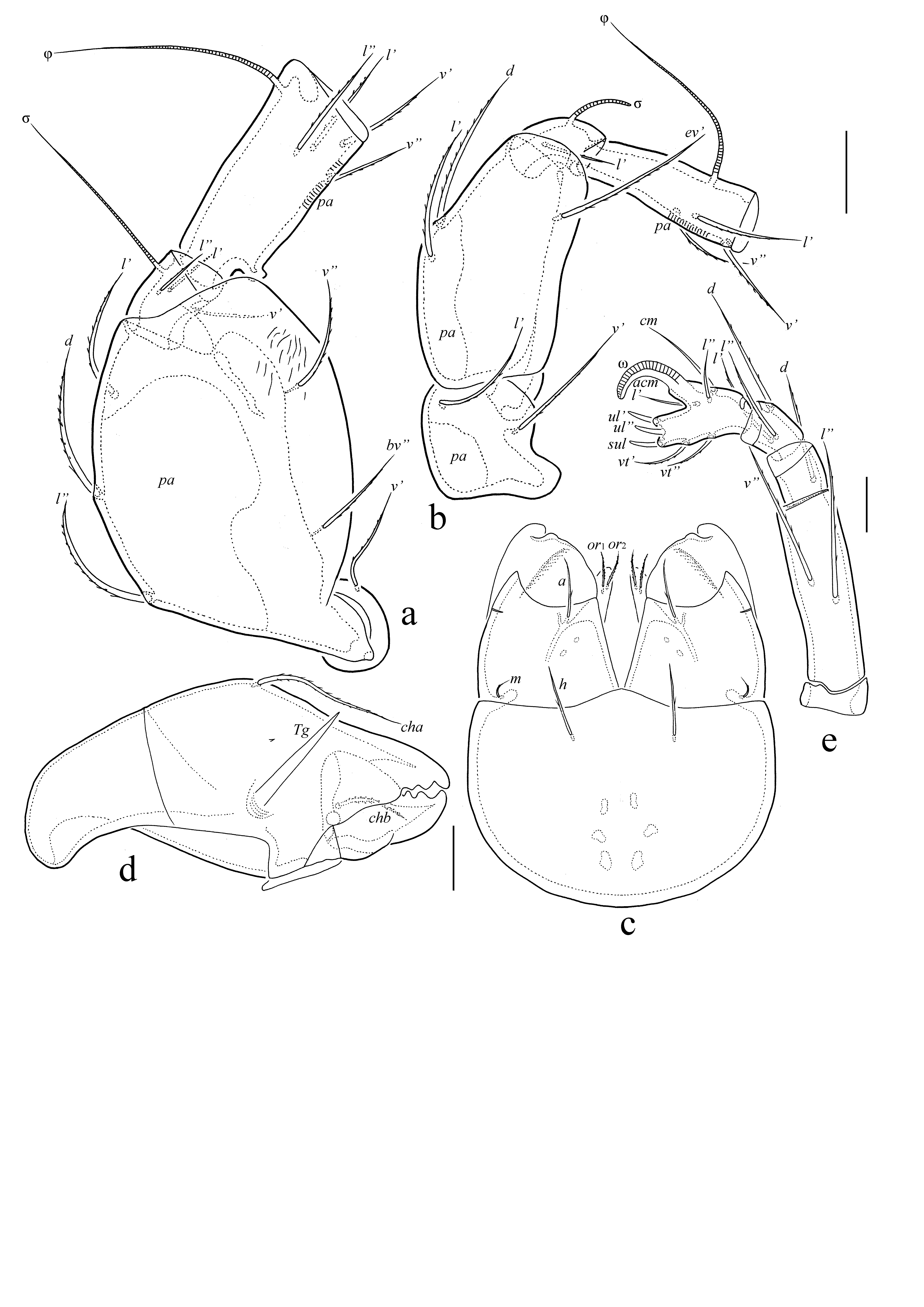 Gnathosoma (Figs 1b, 3c-e) – Subcapitulum size 131–139 × 77–86. Subcapitular setae (a, 20–24; m, 10–12; h, 24–28) setiform, sparsely barbed, m thinnest. Adoral seta (14–16) setiform, densely barbed. Palp (73–82) with typical formula. Postpalpal seta (4) spiniform, smooth. Chelicera (131–139) with two setiform, barbed setae (cha, 45–53; chb, 24–28).