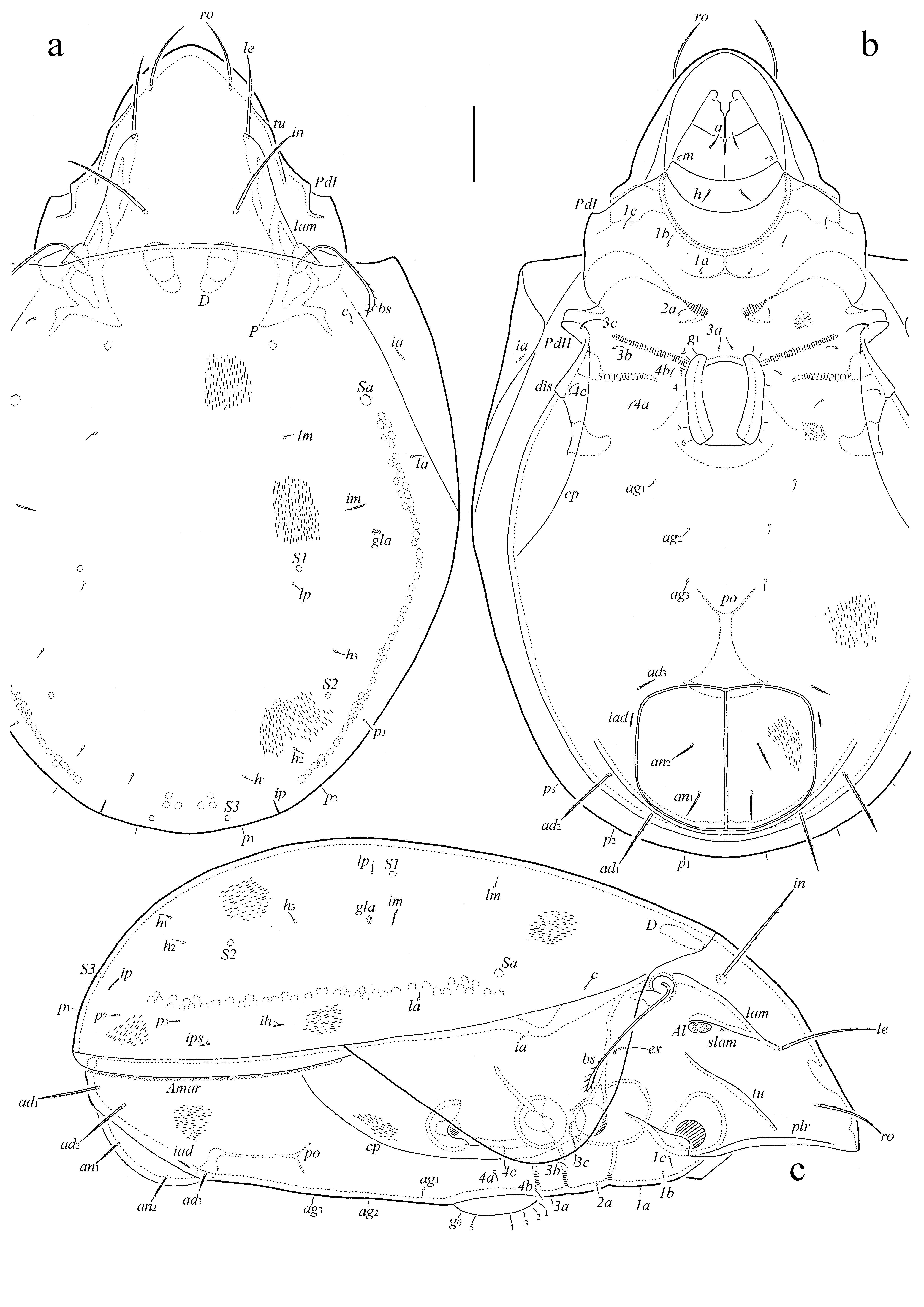 The following abbreviations are used: lam = lamella; slam = sublamella; Al = sublamellar porose area; tu = tutorium; plr = prodorsal lateral ridge; ro, le, in, bs, ex = rostral, lamellar, interlamellar, bothridial and exobothridial setae, respectively; D = dorsophragma; P = pleurophragma; c, la, lm, lp, h, p = notogastral setae; Sa, S1, S2, S3 = notogastral sacculi; ia, im, ip, ih, ips = notogastral lyrifissures; gla = opisthonotal gland opening; a, m, h = subcapitular setae; v, l, d, cm, acm, ul, sul, vt, lt = palp setae; ω = palp and leg solenidion; cha, chb = cheliceral setae; Tg = Trägårdh's organ; PdI, PdII = pedotecta I, II, respectively; 1a, 1b, 1c, 2a, 3a, 3b, 3c, 4a, 4b, 4c = epimeral setae; dis = discidium; cp = circumpedal carina; g, ag, an, ad = genital, aggenital, anal and adanal setae, respectively; iad = adanal lyrifissure; Amar = marginal porose area; po = preanal organ; Tr, Fe, Ge, Ti, Ta = leg trochanter, femur, genu, tibia, tarsus, respectively; pa = leg porose area; σ, φ = leg solenidia; ɛ = leg famulus; v, ev, bv, l, d, ft, tc, it, p, u, a, s, pv, pl = leg setae.