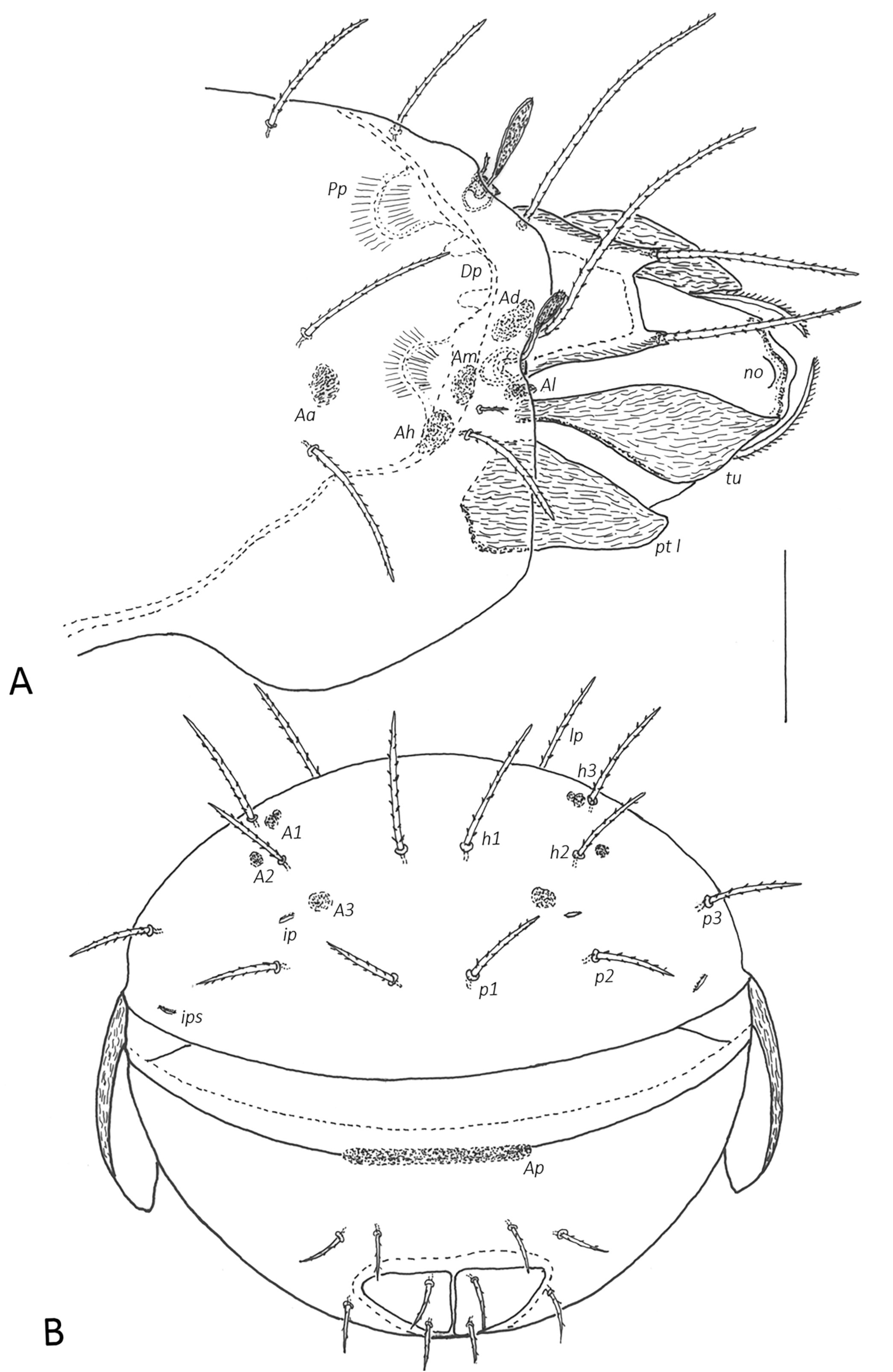 Notogaster (Figs 2, 4, 5) — Anterior margin bent anteriad forming broad notogastral tectum between pteromorphs. Lenticulus indistinct, triangular. Pteromorphs without hinge, immovable, broadly rounded laterally. Ten pairs of notogastral setae, all setiform with small bristles, series c, l, h longer (80–100), p1-3 slightly shorter (60–80). Four pairs of porose areas, round to oval in shape, Aa largest (15–17 x 20–23), A1–A3 smaller (6–8 x 10–12), A1 divided in two parts, lateral area larger, medial smaller. Lyrifissures (ia, im, ip, ih, ips) small, distinct, best visible in lateral view. Opisthonotal gland (gla) opening located laterad to seta lp.