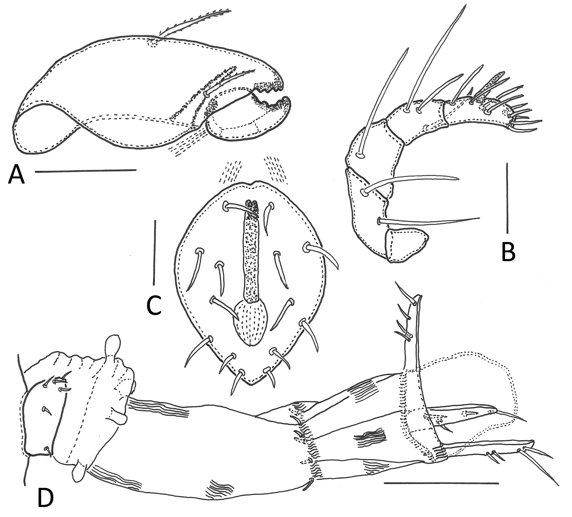 Gnathosoma (Figs 6A, 6B) — Subcapitulum diarthric. Mentum scutiform (85–90 x 85–90). Genal tooth narrow, anteriorly pointed. Subcapitular setae setiform with small bristles, seta h straight (25–30), m curved (\textasciitilde30), a almost smooth (19–22). Adoral setae slightly ciliate (18–22). Palp (\textasciitilde80), setal formula 0-2-1-3-9(+ω). Axillary saccule at base of rutellum present, small. Chelicera (145–155) with two setae, both setiform with bristles, cha (47–50) longer than chb (28–33), movable digit robust, length 40–50, with 4 strong teeth. Trägårdh's organ on paraxial face, tapering anteriad (45–50).