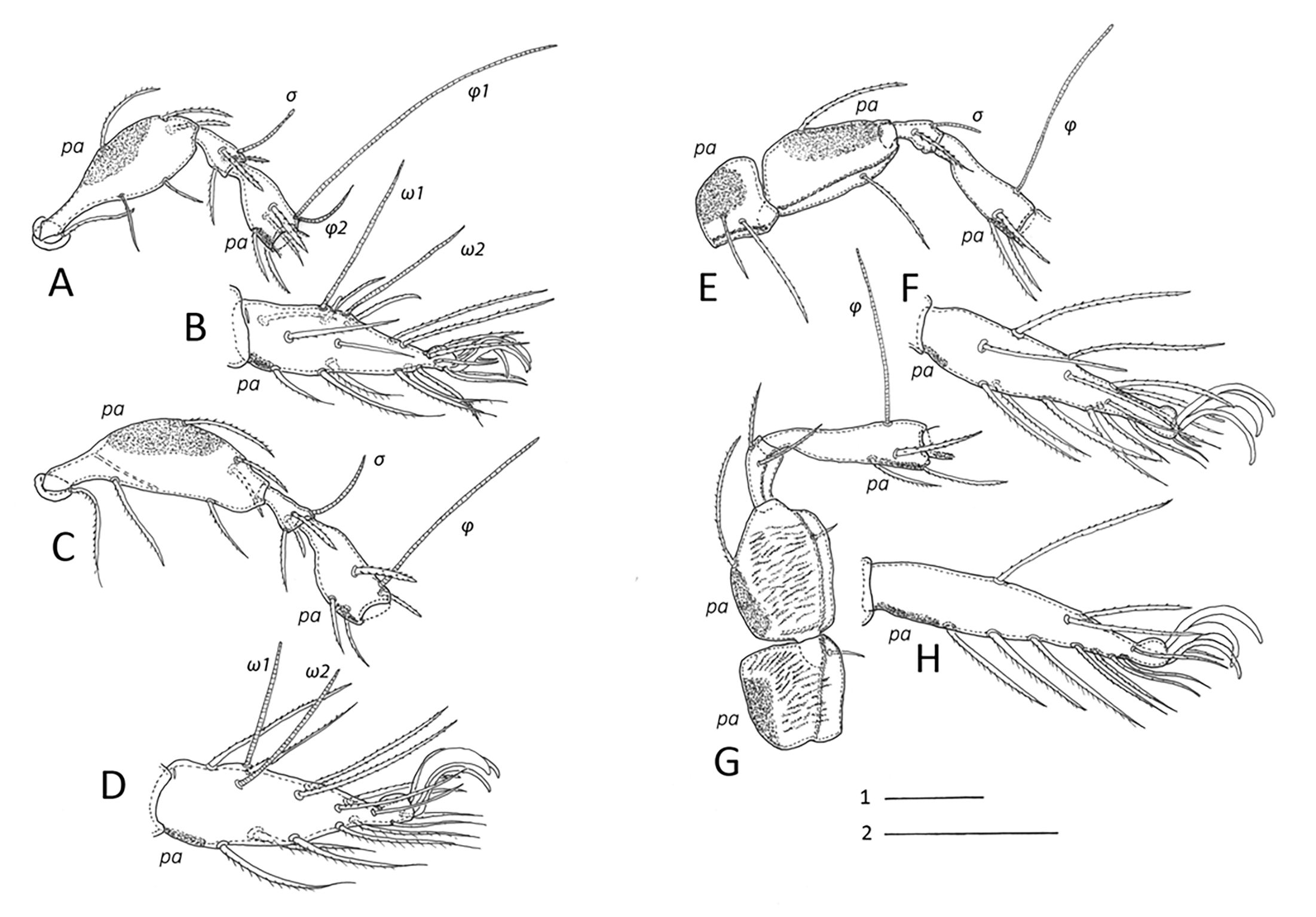 Legs (Fig. 7) — Legs of moderate length (42 to 50 % of body size), leg I (including claws) \textasciitilde260, leg II \textasciitilde270, leg III \textasciitilde260, leg IV \textasciitilde310. All legs tridactylous, lateral claws thinner than medial claw. All femora with ventral thickening, trochanter and femur IV with transverse wrinkles and strong bladelike ventral keel each. Genua I and II distally with ventral spine. Solenidia ω1 and ω2 on tarsi I almost equal in length (95–100), φ1 on tibia I longest (140–160), φ2 shorter (30–40), σ on genu I about same length (35–40). Setae l'' on genua and tibiae I and II considerably thickened (40–45). Almost all setae with short bristles, setae (p) and (u) with very short bristles, seta v on trochanter IV smooth. Setal formula of legs (trochanter to tarsus, solenidia in parentheses): leg I 1 – 5 – 3(1) – 4(2) – 20(2), leg II 1 – 5 – 3(1) – 4(1) – 15(2), leg III 2 – 2 – 1(1) – 3(1) – 15, leg IV 1 – 2 – 2 – 3(1) – 12. Position and length of setae as in Fig. 7. Large porose areas (pa) on all femora and on trochanters III, IV. Porose areas on legs proximoventrally on tarsi I–IV and distoventrally on tibiae I–IV, all small and roundish to elliptical in shape.