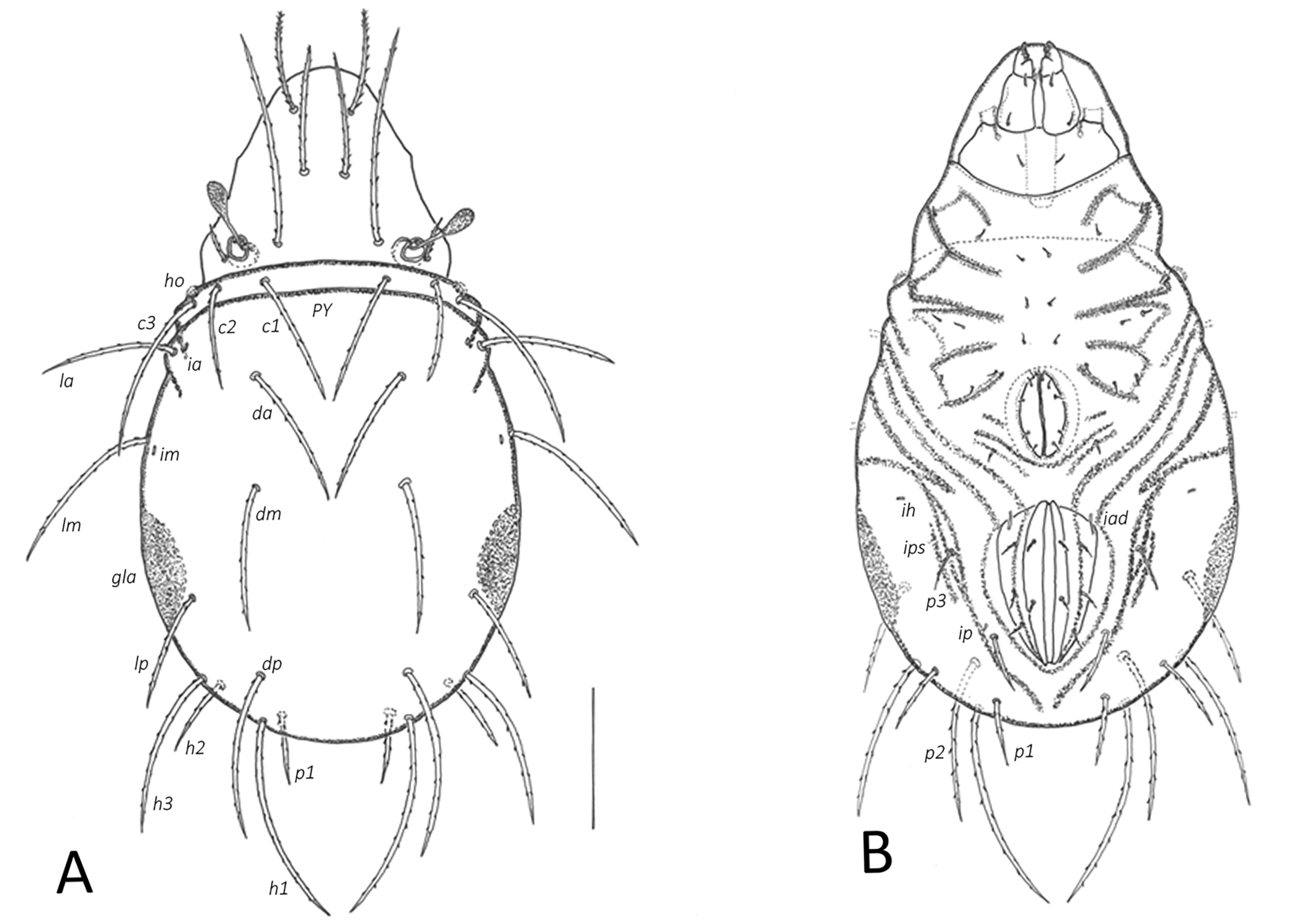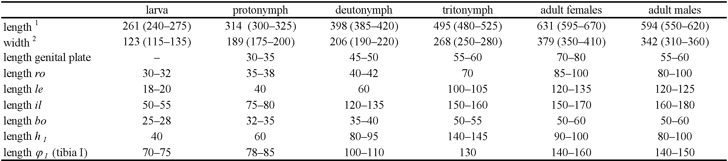 Taxonomical notes — Setae le on short apophyses in all instars, in larva weakly spinose, 15 – 17, in other instars thick, spinose, legs monodactylous in all juvenile instars, tridactylous in adult; larva – size 340 – 360 x 160 – 170, le 15- 17; protonymph – size 440 – 510 x 220 – 250, le 20 – 25, 5 – 6 pairs of genital setae; deutonymph – size 530 – 550 x 280 – 300, le 25 – 30, 14 pairs of genital setae; tritonymph – size 670 – 685 x 345 – 370, le 30 – 40, 17 – 18 pairs of genital setae; adult – size 670 – 750 x 310 – 370, le 30 – 40, 17 – 18 pairs of genital setae.