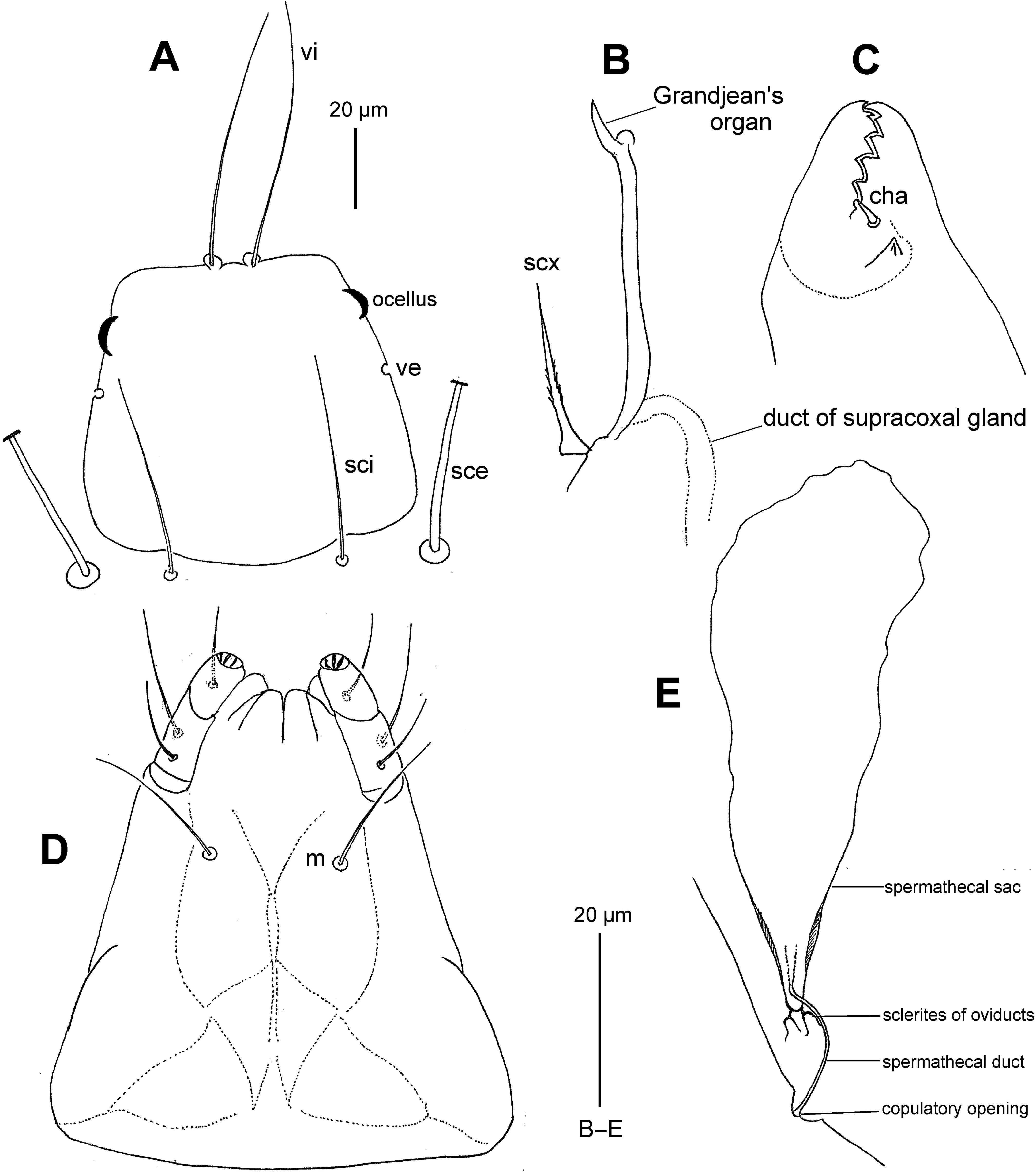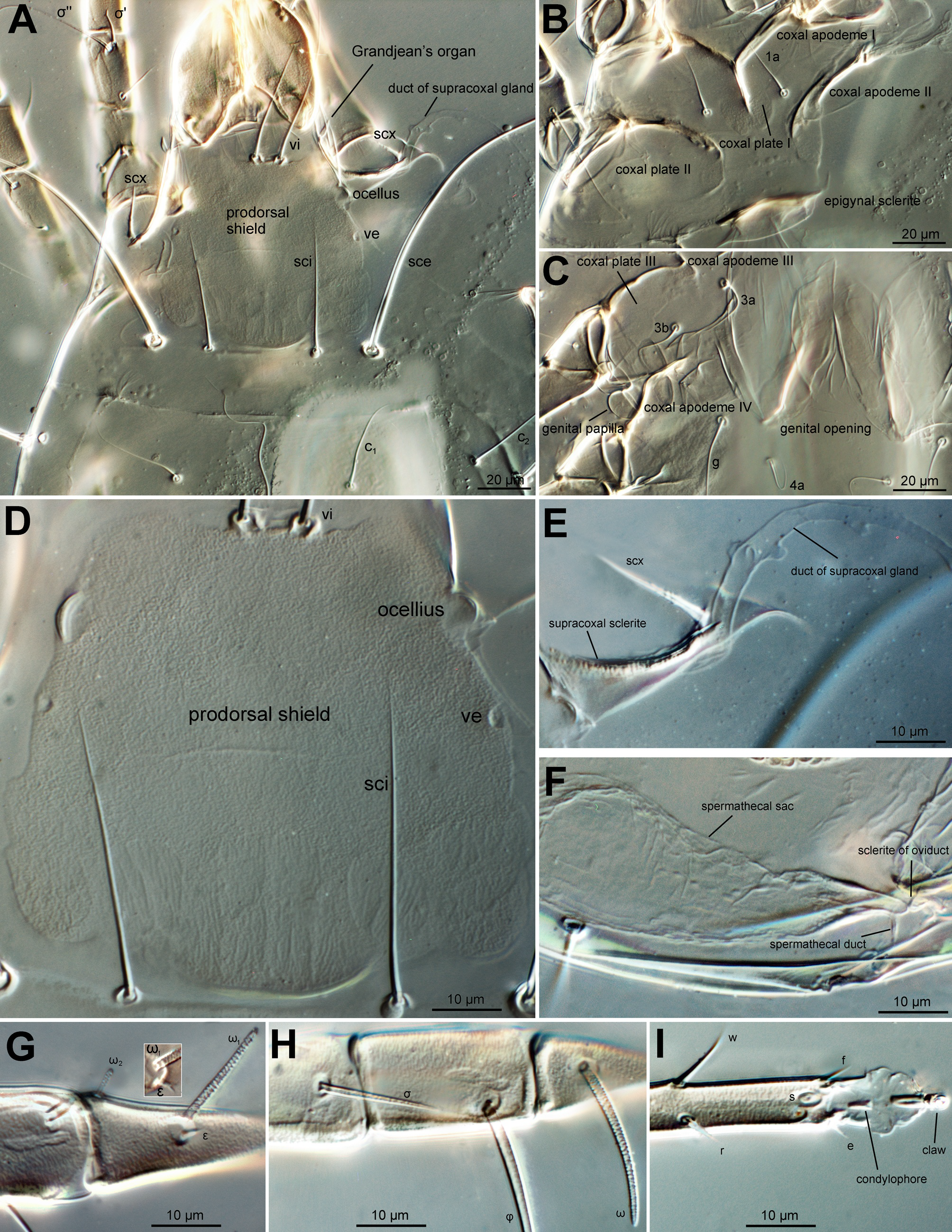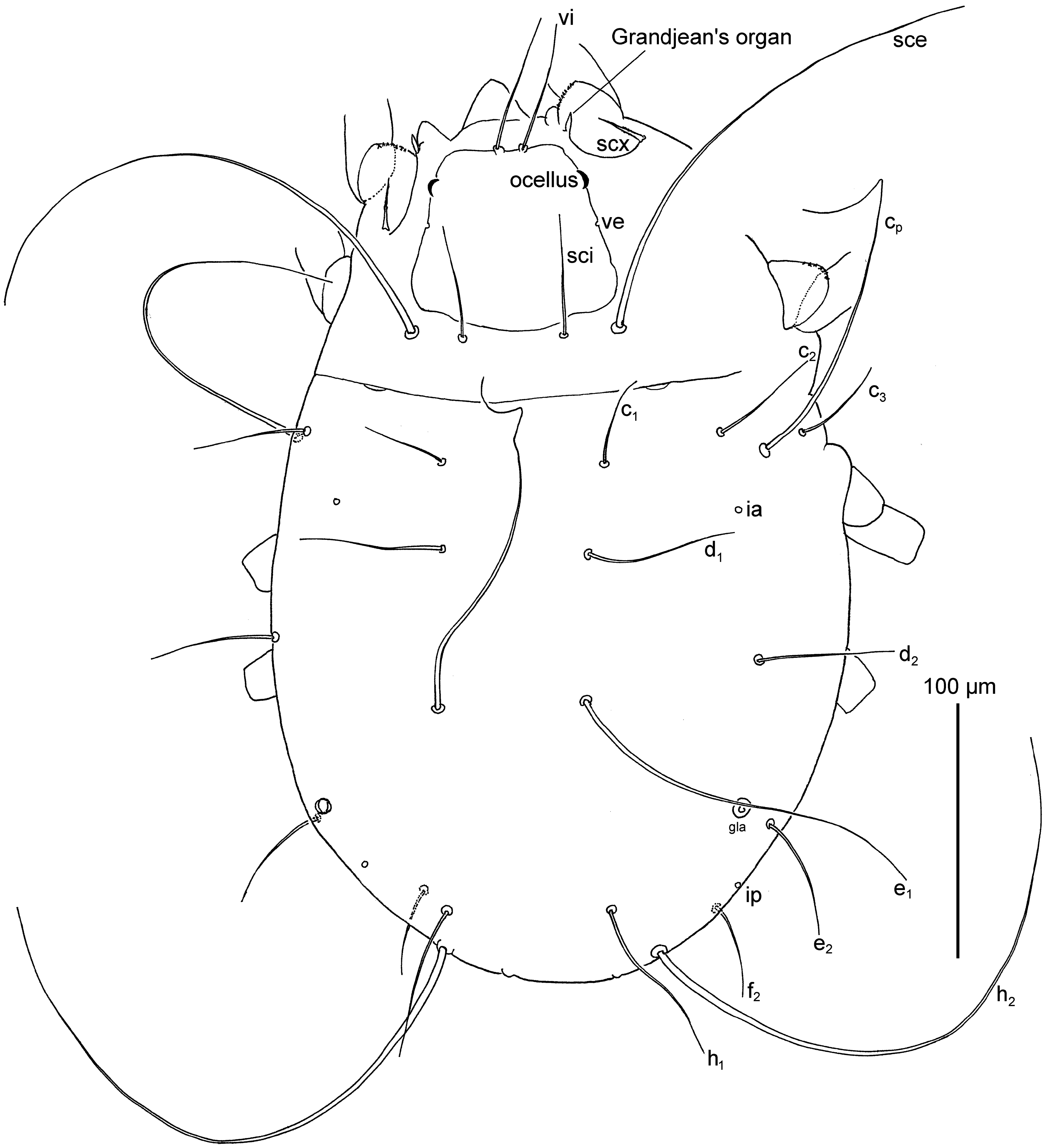 Idiosoma (Figures 1 and 6A) oval, cuticle smooth. Prodorsal shield (Figures 1, 3A and 6D) nearly trapezoidal, finely stippled, posterior one forth areas with faint longitudinal to oblique wrinkles (Figure 6D), posterior margin medially convex and sublaterally concave. Supracoxal sclerite (Figures 3B and 6E) elongate; Grandjean's organ (Figures 1 and 3B) horn-shaped, smooth and short; supracoxal setae scx tapering from base to tip, medially barbed. Ocelli (Figures 1, 3A and 6D) situated close to anterior corners of prodorsal shield; seta vi slightly longer than 4/5 of length of prodorsal shield; setae ve represented by alveoli, situated at lateral margins of prodorsal shield, posterior to ocelli; sce about 2.8–3.4× as long as vi and 3.6–4.2× as long as sci; sci–sci 1.8–2.3× as wide as sci–sce. Opisthonotal gland openings gla located closer to e2 than to d2 , not distinctively coloured. Tiny opisthosomal tubercles visible on some specimens. Hysterosomal setae h3 absent; h2 longest, sce, cp and e1 obviously longer than others; c1 , c2 , c3 , d1 , d2 , e2 and h1 similar in length, f2 positioned on ventral side of idiosoma and shorter than others; e1 2.6–3.4× as long as e2 , h2 1.3–1.9× as long as cp and 4.7–6.9× as long as h1 ; cp 4.2–5.4× as long as c1 .