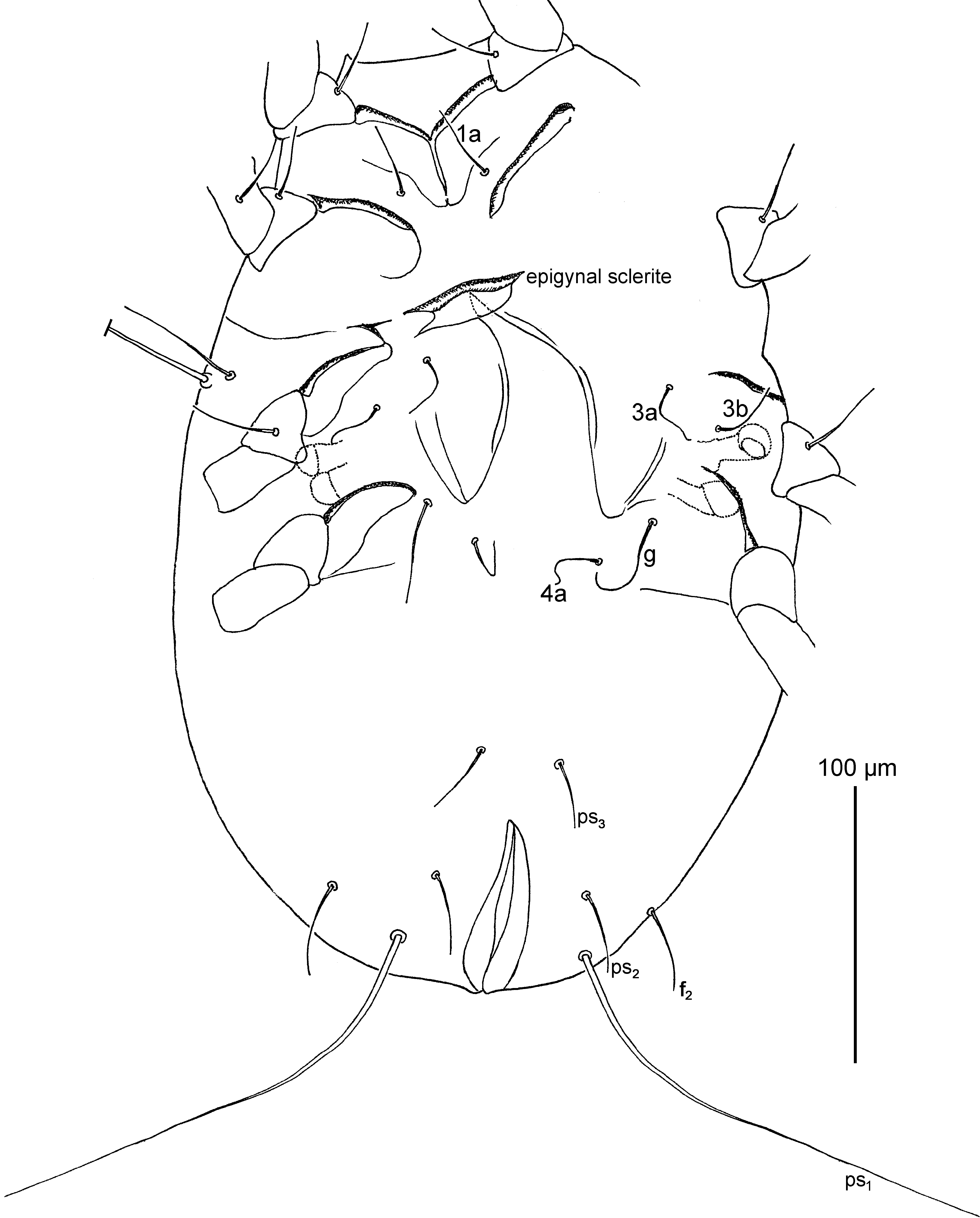 Coxal apodemes I (Figures 2 and 6B) joined at midline, forming a prosternal apodeme directed posteromedially; coxal plates I posteriorly extending beyond apex of prosternal apodeme, slightly concave posteromedially; coxal apodemes II (Figures 2 and 6B) directed posteromedially, coxal plates II large, extending far beyond apex of apodeme II, posterior margin concave posteromedially; sejugal apodeme faint, a simple ridge. Genital opening (Figures 2 and 6C) inverted V-shaped, situated medially between coxae III and IV, epigynal sclerite (Figure 2) situated immediately anterior to genital opening, umbrella-shaped in middle, extending laterally beyond inner tips of apodemes III; apodemes III directed medially; apodemes IV directed anteromedially and jointed with post-apodemes of coxae III. Ventral setae 1a inserted lateral to prosternal apodeme, 3a lateral to genital opening, g posterior to second pair of genital papillae, 4a posterior to lateral arms of genital opening. Anal opening far posterior to genital opening, slightly shorter than genital opening, surrounded by 3 pairs of pseudanal setae, ps1 longest, about 4.6–5.5× as long as ps2 and 4.8–6.1 ps3 . Copulatory opening close to posterior margin of idiosoma (Figures 3E and 6F); spermathecal duct (inseminatory canal) a thin cylindrical tube, slightly widening as it reaches spermathecal sac (seminal receptacle); sclerotised base of spermathecal sac bell-shaped, a pair of bell-shaped sclerites of oviducts situated at end of spermathecal sac, sclerites nearly as large as spermathecal base.