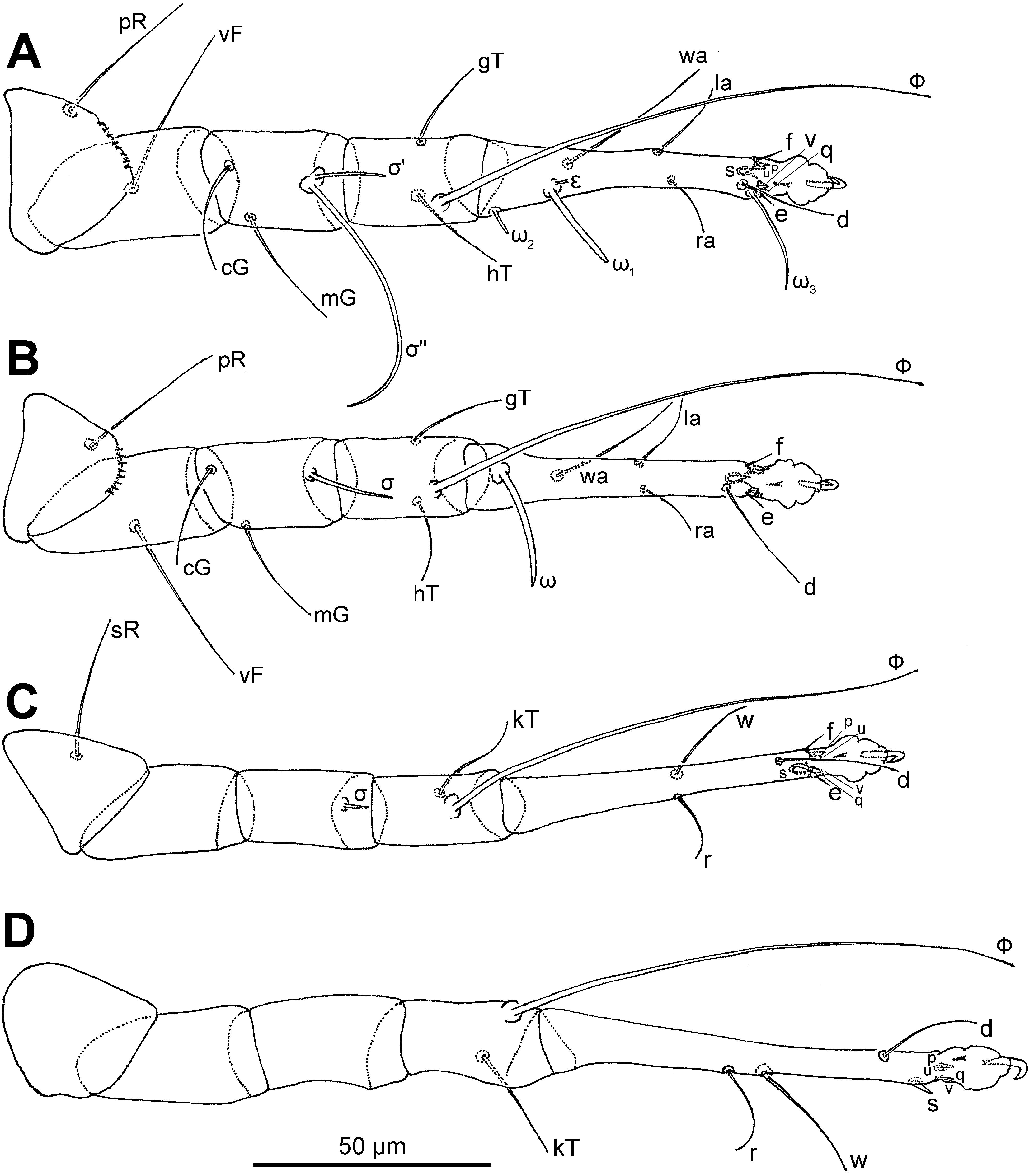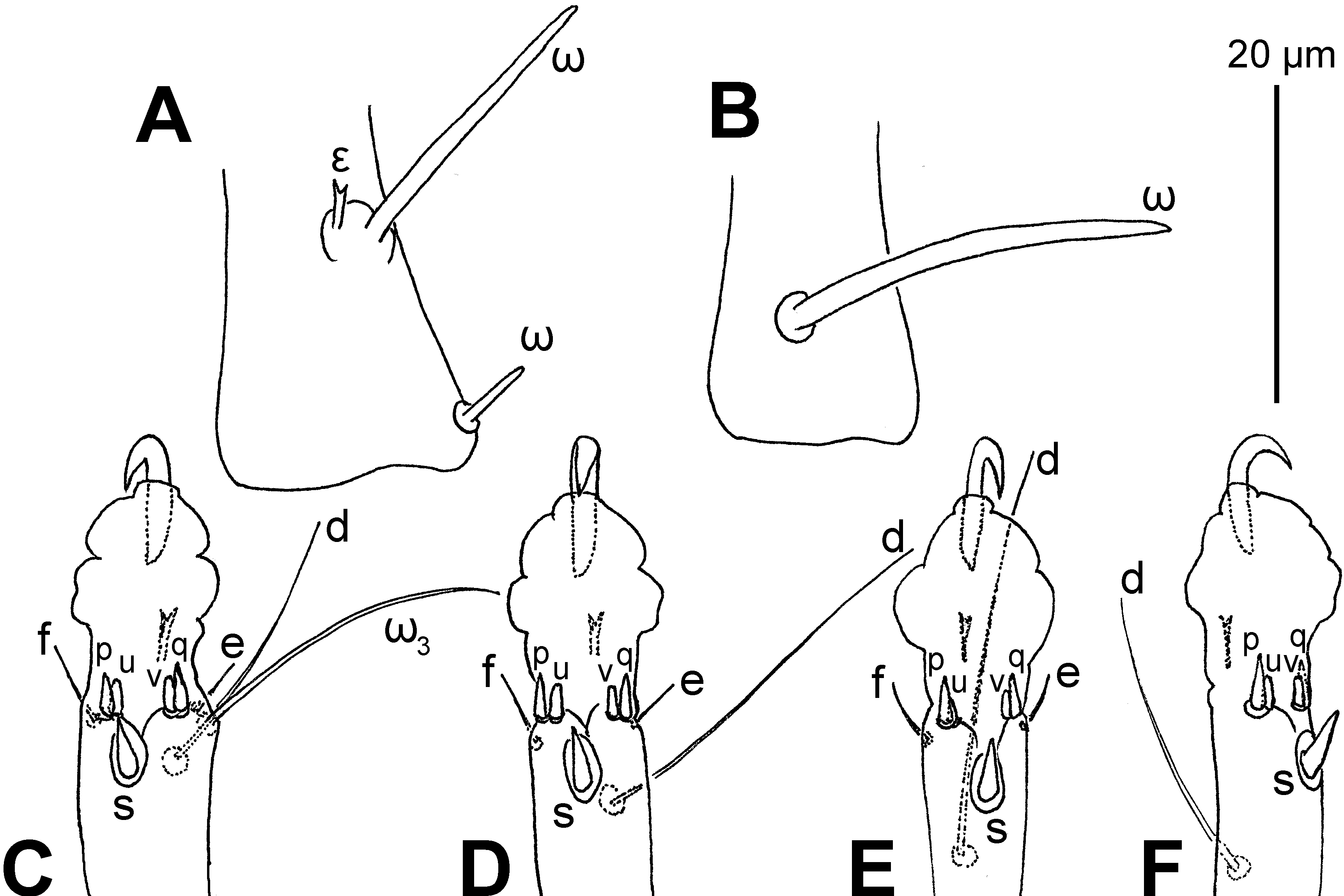 Leg IV (Figures 4D and 5F). Trochanter, femur and genu nude; tibial solenidion φ about extending to tarsal claw tip, kT about as long as w on tarsus; tarsus more than 5.9–6.8× as long as its basal width; r situated proximal to w, d extending to base of tarsal claw; e and f absent; ventro-terminal spines s (4.0–5.0) conical; p (3.5–4.0) longer than q (2.5–3.0), both conical; u and v subequal (2.0–2.5) and both apically truncate.