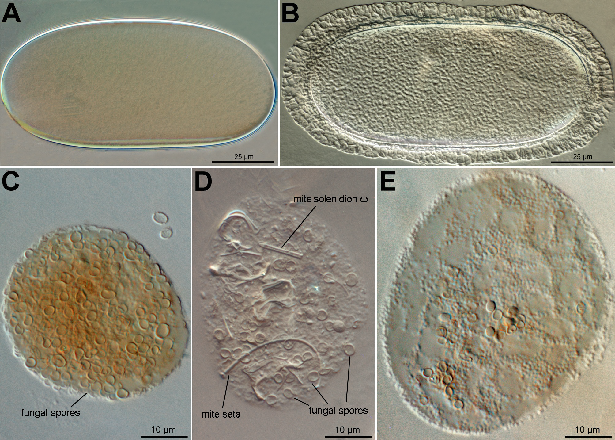 Digested spores of Penicillium sp. (Eurotiales: Trichocomaceae) and fragmented mite body parts were found in the food boli (Figures 7C–E), suggesting that O. africana sp. n. is likely to be detritivores. The mite solenidion and setae in the food boli (Figure 7D), are possibly from the shed exoskeletons of members of the mite population.