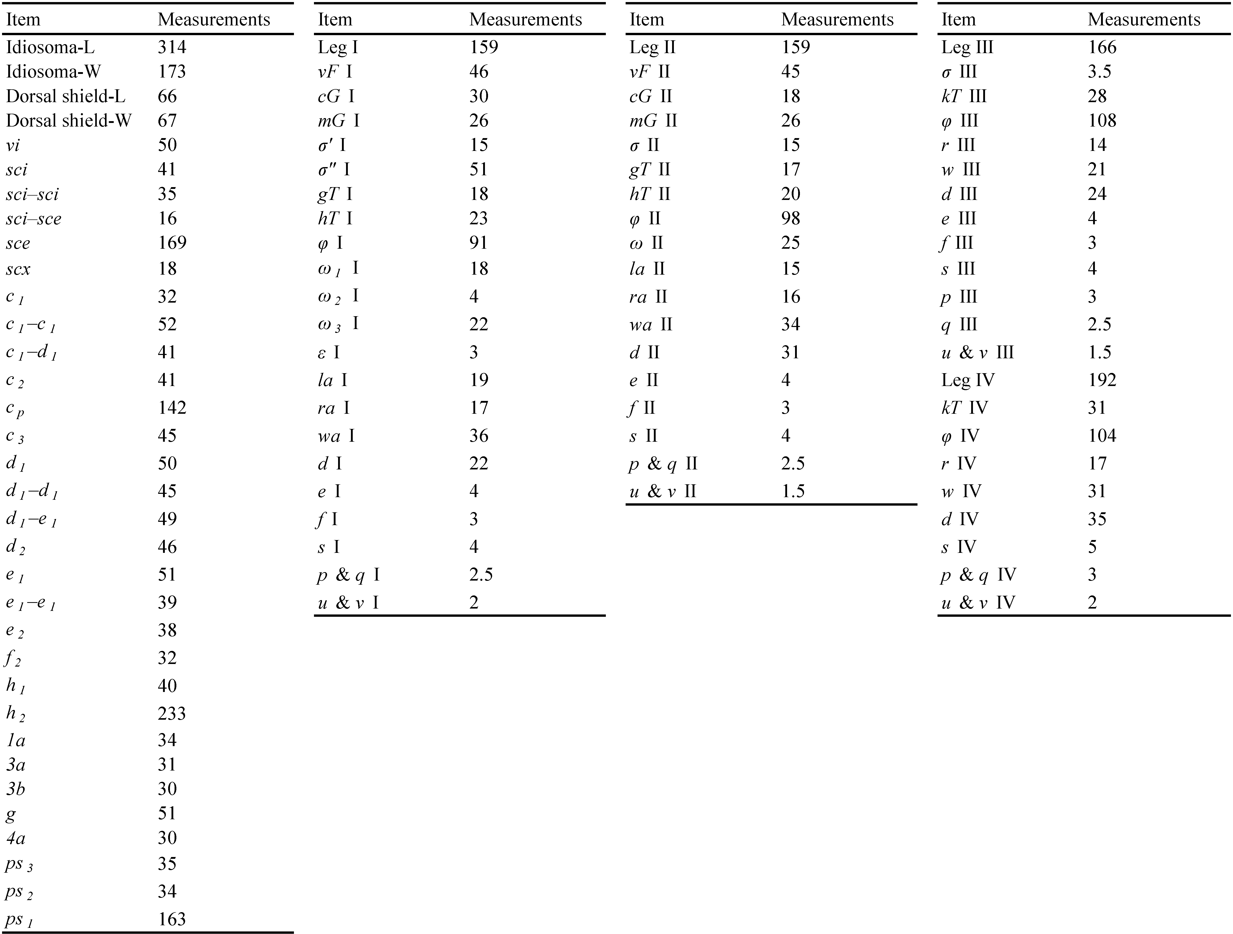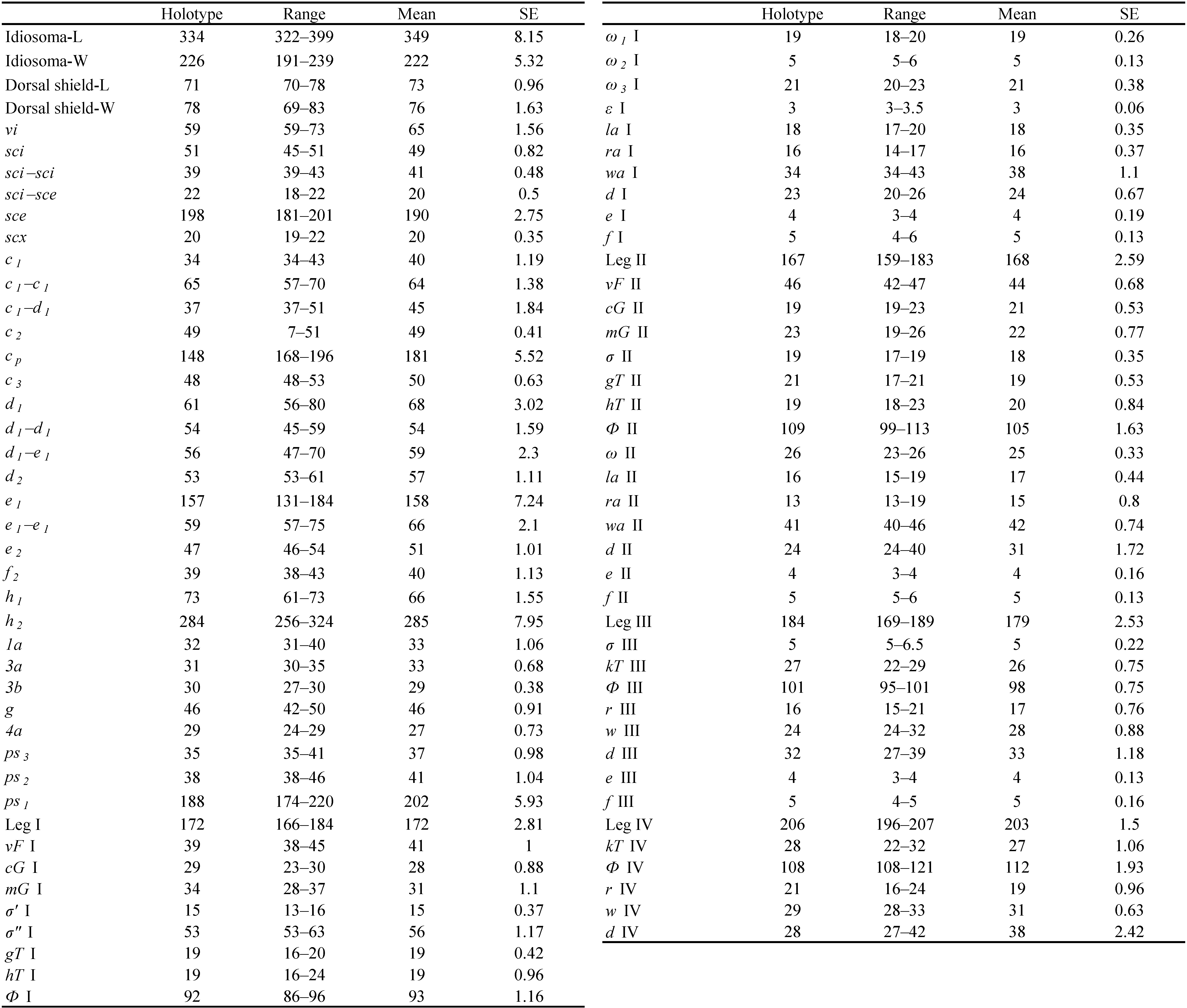 ADULT FEMALE. Idiosomal setae sce about 2.8–3.4× as long as vi and 3.6–4.2× as long as sci; sci–sci 1.8–2.3× as wide as sci–sce; h2 1.3–1.9× as long as cp and 4.7–6.9× as long as h1 ; cp 4.2–5.4× as long as c1 ; e1 2.6–3.4× as long as e2 . Opisthonotal gland opening gla located much closer to e2 than to d2 . Leg I with genual solenidia σ″ 3.5–4.2× as long as σ′.