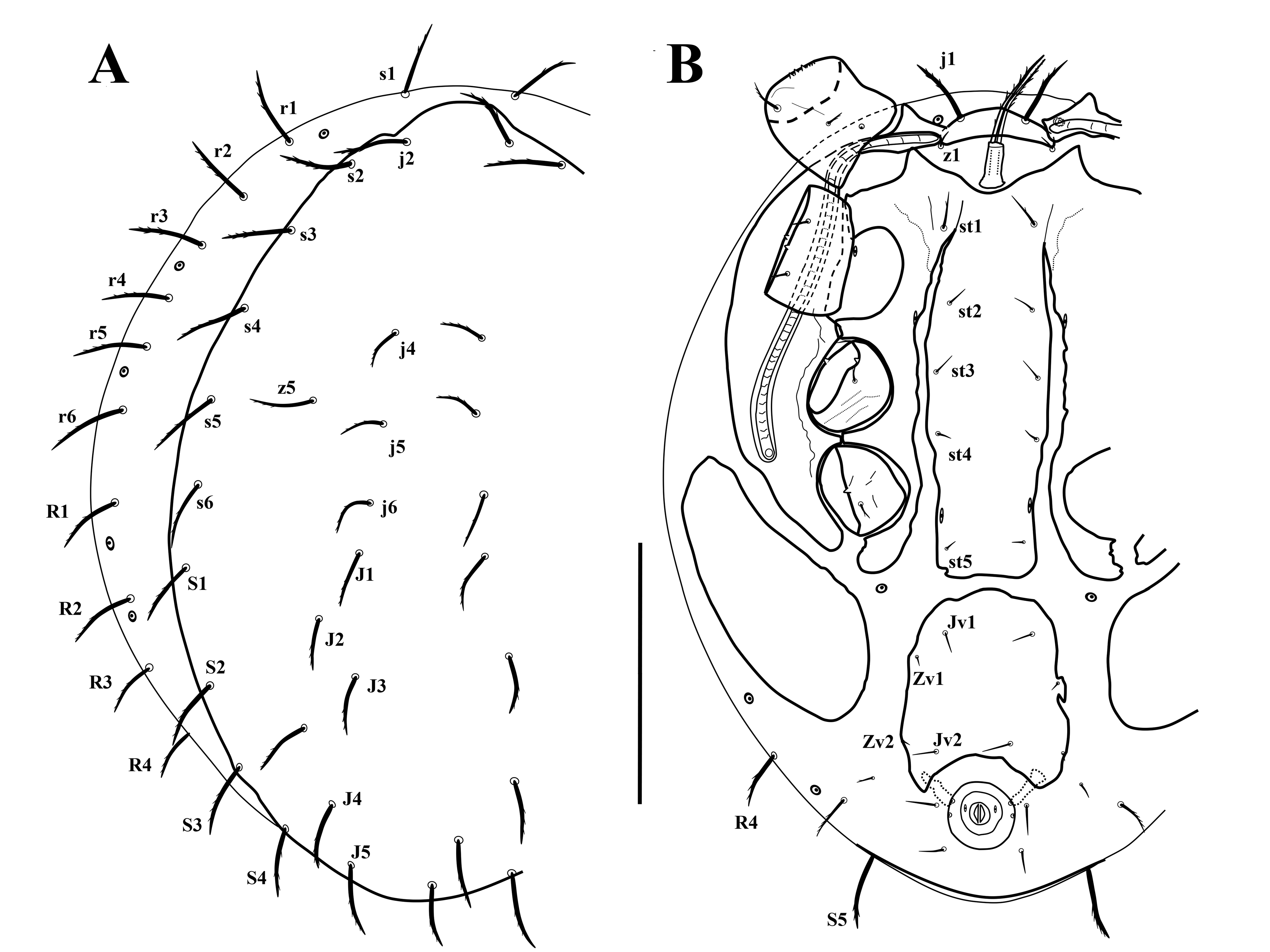 Morphological observations, measurements, and illustrations were made using a Zeiss Axioskop compound microscope with phase contrast optics and a drawing tube. Additional images were prepared using the automated Z-stacking feature of the Nikon NIS Elements package on a Nikon Eclipse 90i (Melville, NY) compound microscope with a PC controlled Ds-5M-U1 digital camera at the Acarology Laboratory of the Ohio State University (OSAL). Measurements were made in micrometers (μm). Dorsal shield length and width were taken from the anterior to the posterior shield margins along the midline and the lateral margins at the broadest level, respectively. The length and width of the sternal and ventral shields were measured from the anterior to posterior margins of the shields along the midline and from the lateral margins of the shields at the broadest point, respectively. The length of the second cheliceral segment was measured from the base of the segment to the apex of the fixed digit, the length of the movable digit from the base to the apex of the chela. Leg lengths were taken from the base of the coxa to the apex of the tarsus, excluding the pretarsus. Notation for setae on the dorsal and ventral idiosoma follows Athias-Binche and Evans (1981), and palp and leg chaetotaxy follow Evans (1963, 1972).