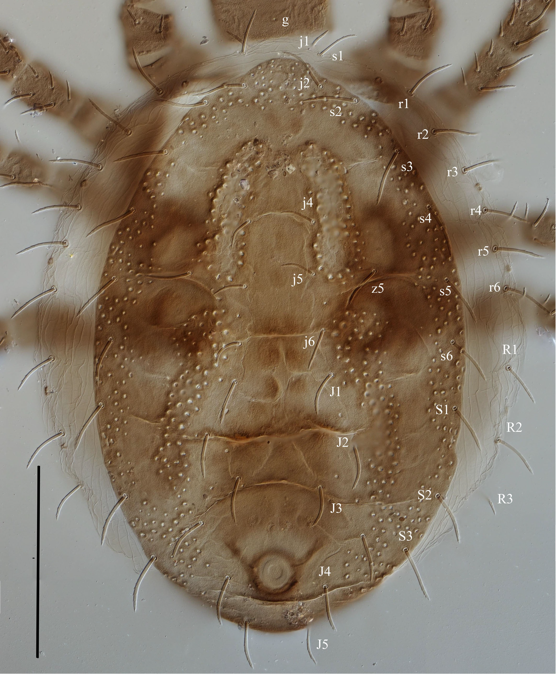 Dorsal shield with 20 pairs of setae; setae z5 shorter than s5, and longer than adjacent j-series setae. Dorsolateral soft cuticle with 11 pairs of subequal setae including s1, r1–r6, R1–R4. Setae j1 inserted anteroventrally on well-developed small vertex platelet. Setae j1 and s1 subequal in length. Setae st1 markedly longer than st2–st5. Ventral shield with four pairs of setae; soft cuticle between metapodal and ventrianal shields devoid of setae. Hypostomal setae h2–h3 and pc barbed.