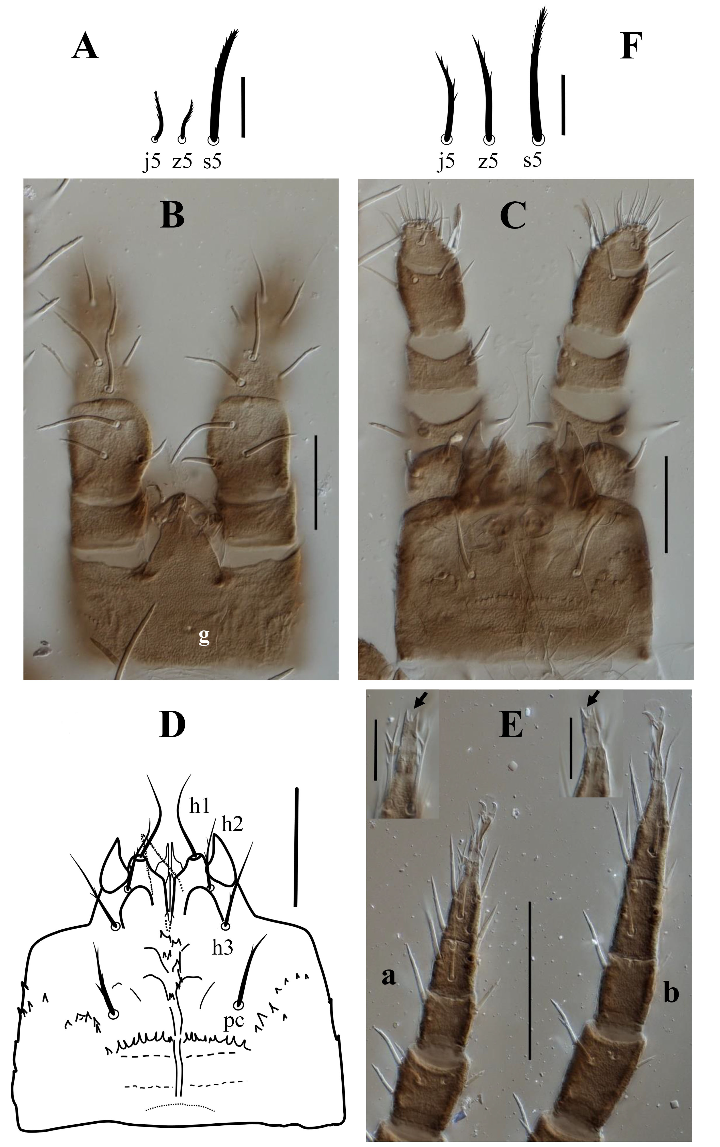 3. Setae s1 on dorsal shield and short, as long as z1; dorsolateral soft cuticle setae variable in length; setae z5 less than half the length of s5 and shorter than adjacent j-series setae (Figure 4F)