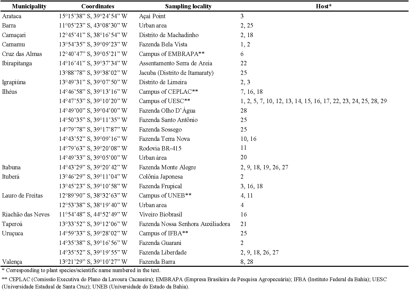 Mite specimens collected between March 2007 and November 2021 from fifteen municipalities in the Bahia state territory, northeastern Brazil were identified for the present study. Samples consisted of leaves and branches of twenty-nine plant species/varieties in seventeen families: Anarcadiaceae – (1) Spondias mombin; Arecaceae – (2) Cocos nucifera, (3) Euterpe oleracea, (4) Veitchia merrillii; Boraginaceae – (5) Cordia trichotoma; Bromeliaceae – (6) Ananas comosus; Euphorbiaceae – (7) Hevea brasiliensis; Heliconiaceae – (8) Heliconia bihai, (9) Heliconia psittacorum x H. spathocircinada cv. Golden Torch, (10) Heliconia rostrata, (11) Heliconia sp., (12) Heliconia sp. var. Irish Red; Lecythidaceae – (13) Lecythis lurida; Malpighiaceae – (14) Malpighia emarginata; Malvaceae – (15) Malvaviscus arboreus, (16) Theobroma cacao, (17) Theobroma grandiflorum; Musaceae – (18) Musa sp.; Myrtaceae – (19) Psidium guajava; Orchidaceae – (20) Phalaenopsis sp.; Oxalidaceae – (21) Averrhoa carambola; Passifloraceae – (22) Passiflora edulis; Rubiaceae – (23) Coffea arabica, (24) Morinda citrifolia; Rutaceae – (25) Citrus sp.; Zingiberaceae – (26) Alpinia purpurata var. Rose, (27) Alpinia purpurata var. Red, (28) Etlingera elatior, (29) Zingiber spectabile. Numbers in parenthesis referred to above for each plant species are presented in Table 1 with the respective sampling localities.
