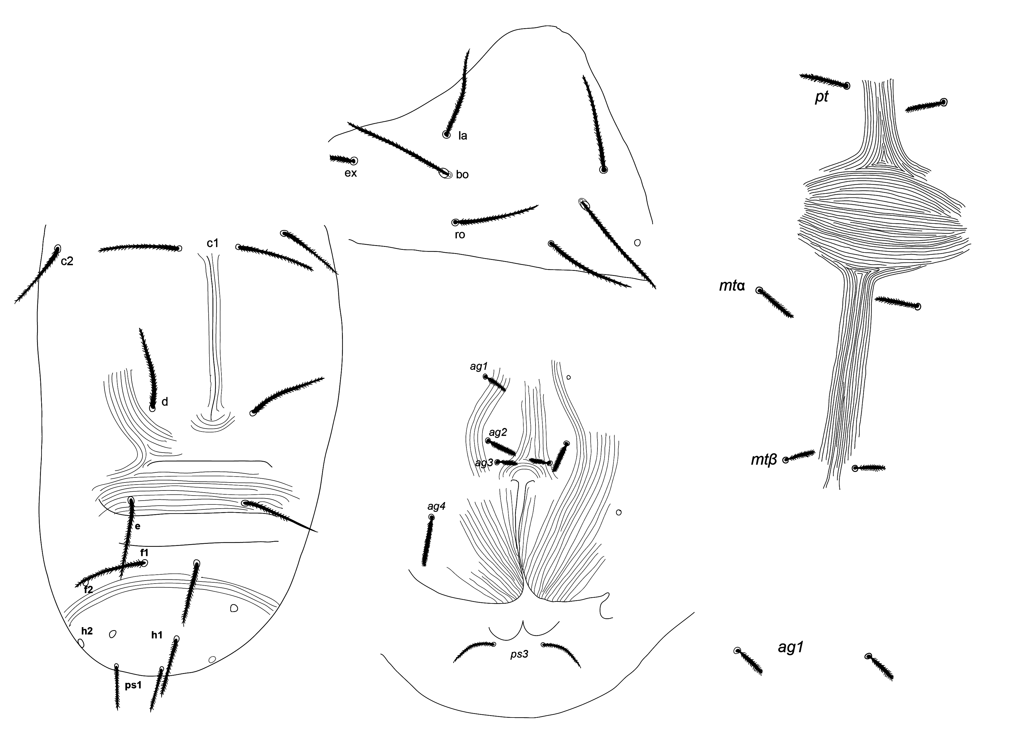 Venter — Striae longitudinal between metasternal setae. All ventral setae smooth and clearly shorter than dorsal setae, except for setae on the coxae which are serrate and longer. Setae pt, mta and mtβ almost aligned longitudinally (mta slightly laterally to imaginary line pt- mtβ). Four pairs of aggenital setae. One pair of acetabula. Setae ps3 anterolateral of anal opening with small, striated spindle-shaped excrescence in between, not visible in specimen used for drawing but visible in other USA specimens. Epimeral formula: (3-1-4-2) (Figure 1 & 2).