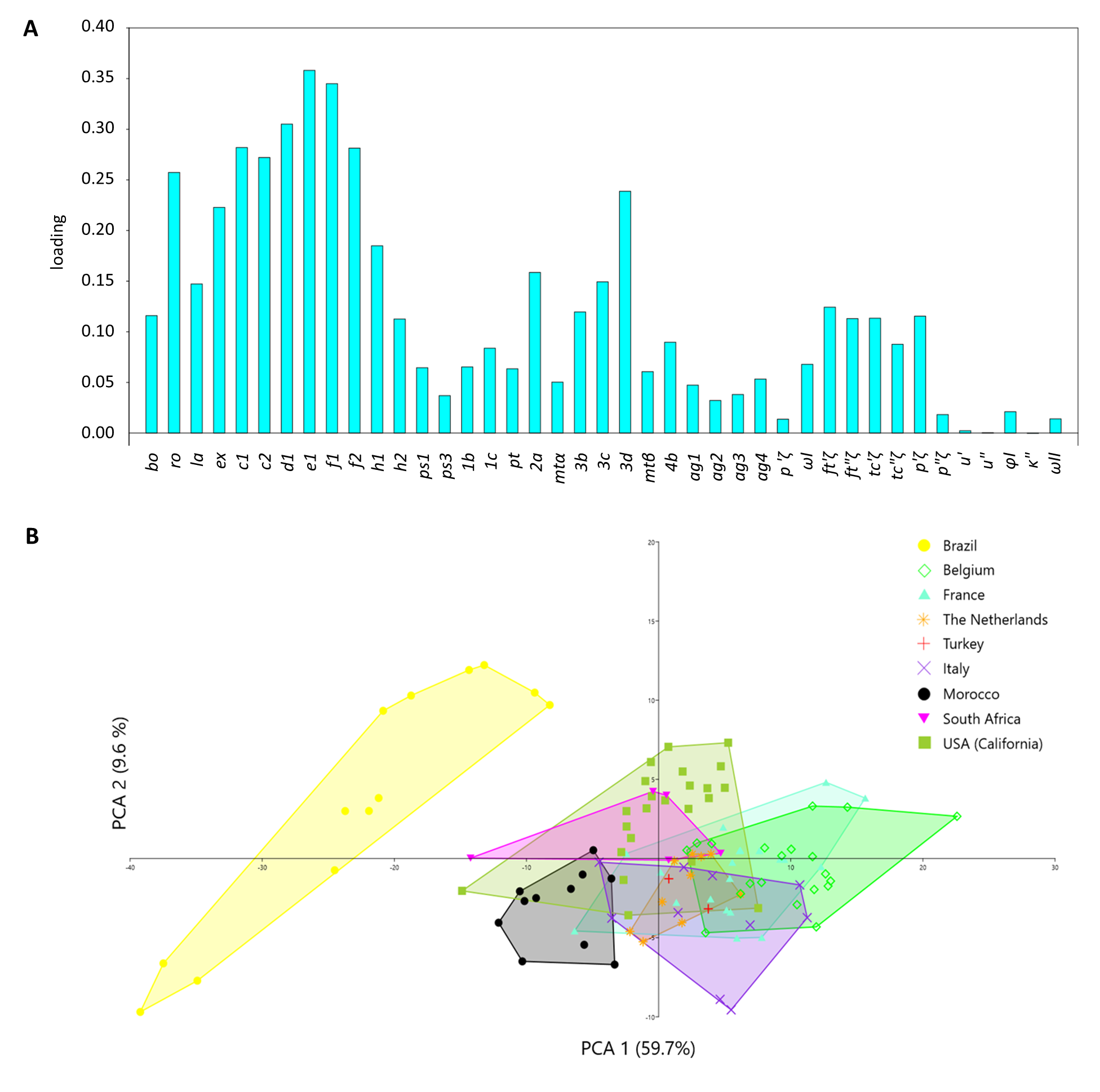 The measurements of reared (mass rearing or SFEL) females fell within the range of the wild specimens for Belgium, France, California (USA), or the other way around for countries where few wild specimens were available (The Netherlands, Morocco). So, for the PCA analysis the specimens of each country or rearings thereof were pooled. A total of 114 measured specimens were included: California (USA): 20; Belgium: 20, France: 20, The Netherlands: 10, Spain: 3, Italy: 10, Türkiye: 2, Morocco: 11, South Africa: 5, and Brazil: 13. The PCA analysis was done with PAST (version 4.03). Based on morphological measurements, convex hulls were created.