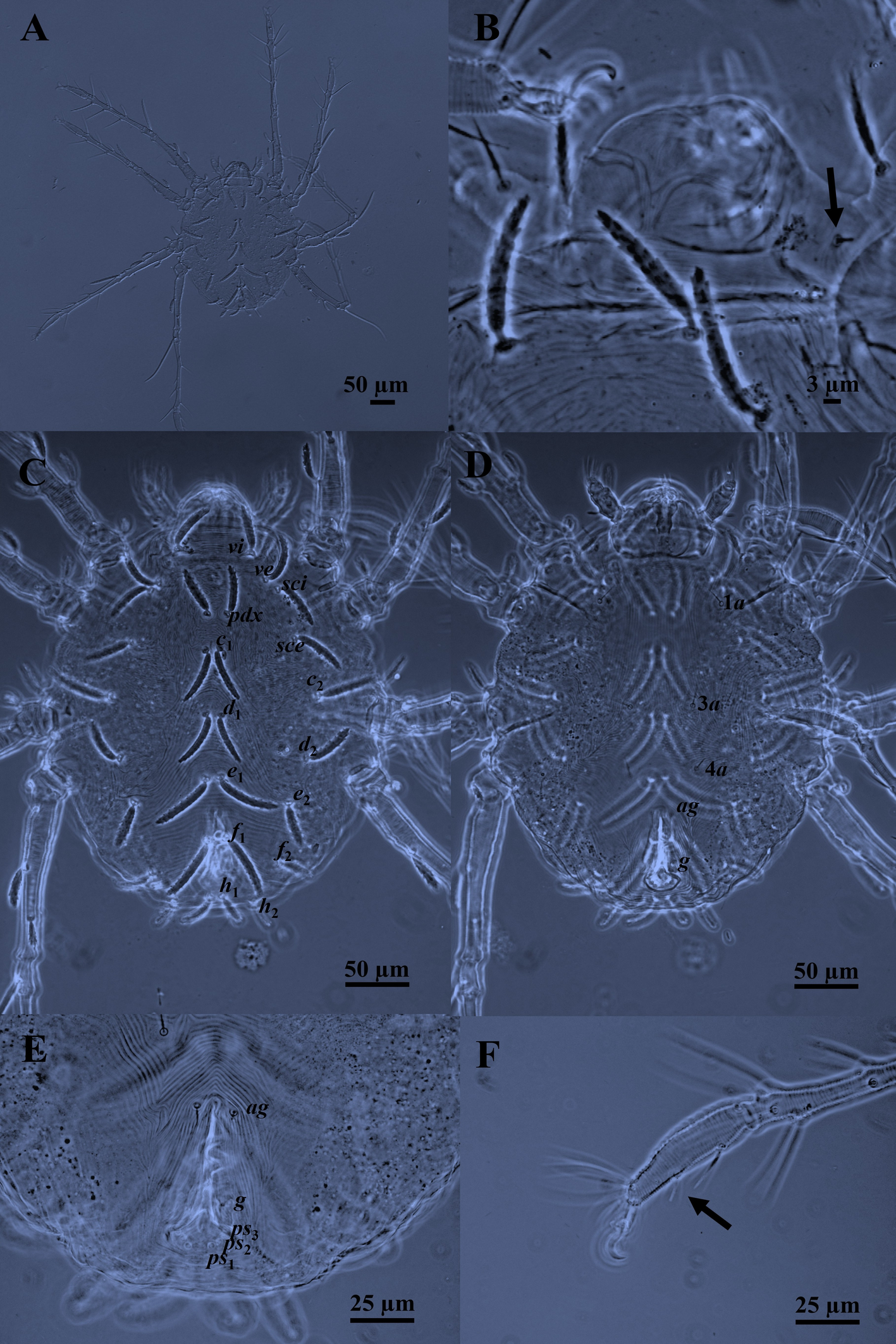 Idiosomal dorsum — Idiosoma broadly oval; two pairs of eyes anterolateral to sce, anterior pair smaller than posterior pair; cuticular striae transverse, oblique, and arched; cuticular striae transverse between vi–vi, striae arching between c1–d1–e2 (but diagonal behind e2); transverse between e1–f1–h1; longitudinal (and often oblique) thin striae laterally between c1–c2, d1–d2; shield-like areas carrying setae c2, d2 and e2; with 15 pairs of distinctly serrated setae, slightly curved; five pairs of prodorsal setae (vi, ve, sci, pdx, sce) and 10 pairs of dorsal opisthosomal setae (c1-2, d1-2, e1-2, f1-2, h1-2) all inserted on small tubercles (Figs 1C and 2C); some dorso–central setae shorter than interval to setae next behind; setae f1 ≥ e1 are the longest and h2 the shortest (f1 ≥ e1 ≥ c2 ≥ d1 ≥ c1 ≥ sci = pdx ≥ vi ≥ sce ≥ ve = d2 ≥ e2 > f2 ≥ h1 > h2, based on mean). Length of dorsal setae: vi 40–42, ve 38–40, sci 40–45, pdx 40–45, sce 38–43, c1 44–45, c2 50, d1 42–50, d2 38–40, e1 51–57, e2 36–39, f1 54–55, f2 30, h1 25–30, h2 23–24. Distance between setae: vi–vi 50–52, ve–ve 75–80, sci–sci 94–100, pdx–pdx 10–15, sce–sce 118–128, c1–c1 10–16, c2–c2 150–165, d1–d1 12–14, d2–d2 134–140, e1–e1 10–15, e2–e2 112–114, f1–f1 13–17, f2–f2 92–98, h1–h1 10, h2–h2 60–62.