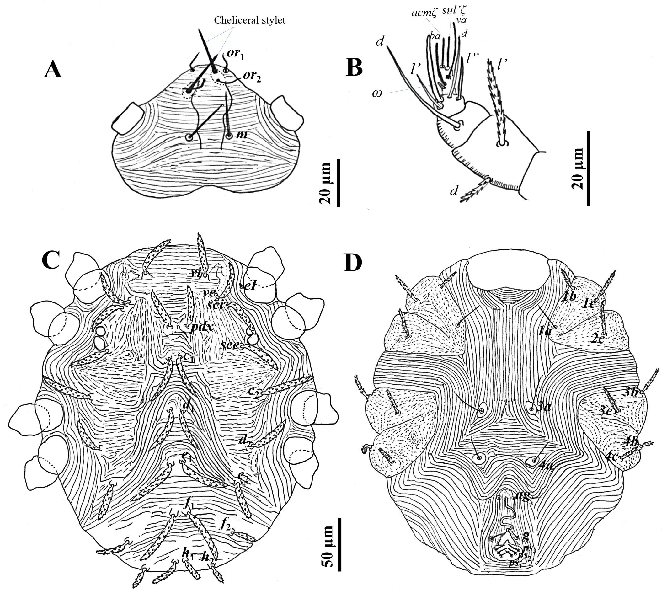 Gnathosoma — Stylophore with one pair of peritremes forming a complete loop. Dorsal infracapitulum with pair of supracoxal setae ep (Figs 1B and 2A). The ventral infracapitulum with three pairs slender and simple setae: the m setae 20 long, two pairs of adoral setae or1 6 and or2 6. Distance between the m setae (m–m) 16–17, or1–or1 15, or2–or2 8–10. Cheliceral stylet 20–22 long (Fig. 2A). Palps, five-segmented (Fig. 2B): trochanter without setae; femur with two serrated setae (d 10, l′ 23), genu with one tactile seta d, tibia with three tactile setae (l′, l″ and d) and one sword‐like seta, tarsus with two eupathidia (acmζ, sulζ), two tactile setae (ba, va), and a small solenidion (ω) 3.