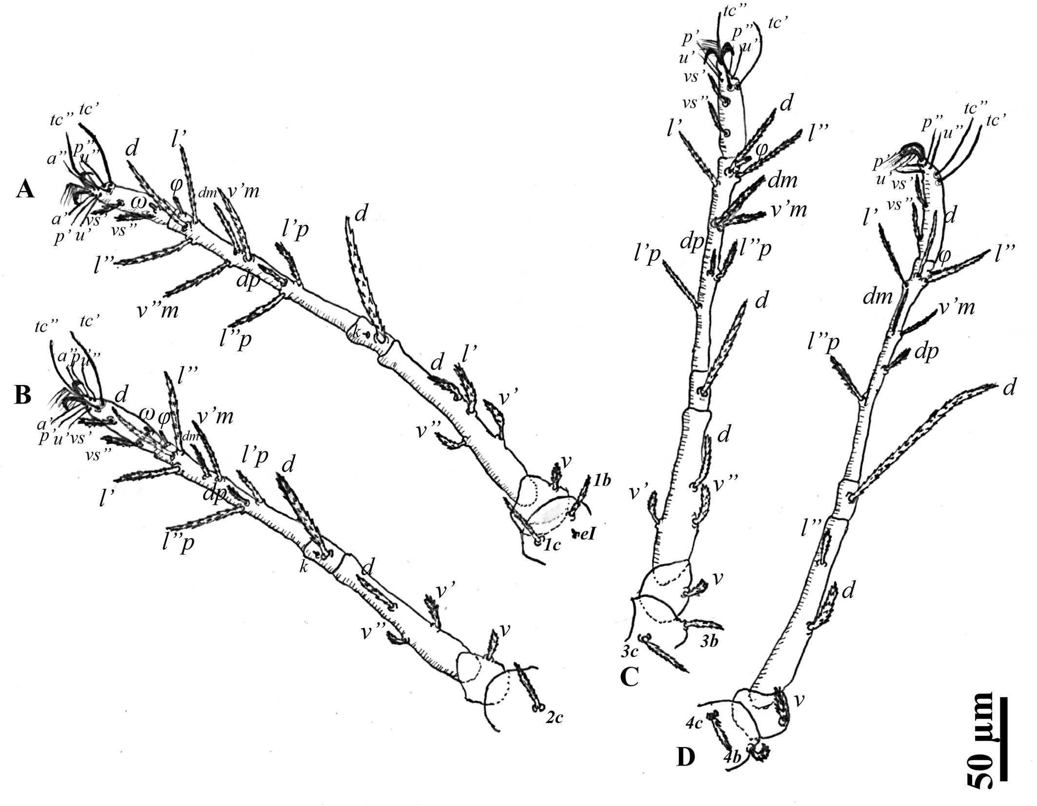 Tarsi I–IV each with two mid–ventral setae; coxae II with one seta; femura I–IV with 4–3–3–2 setae; setae f1 ≥ e1, and are the longest of dorsocentral setae; most distal seta on femura I–IV not reaching articulation facet between genu and femur; genual setae I–III reaching slightly beyond the base of basal tibial seta; genual setae I–IV lengths as follows: I (70–74), II (65–66), III (70–74), IV (108–118).