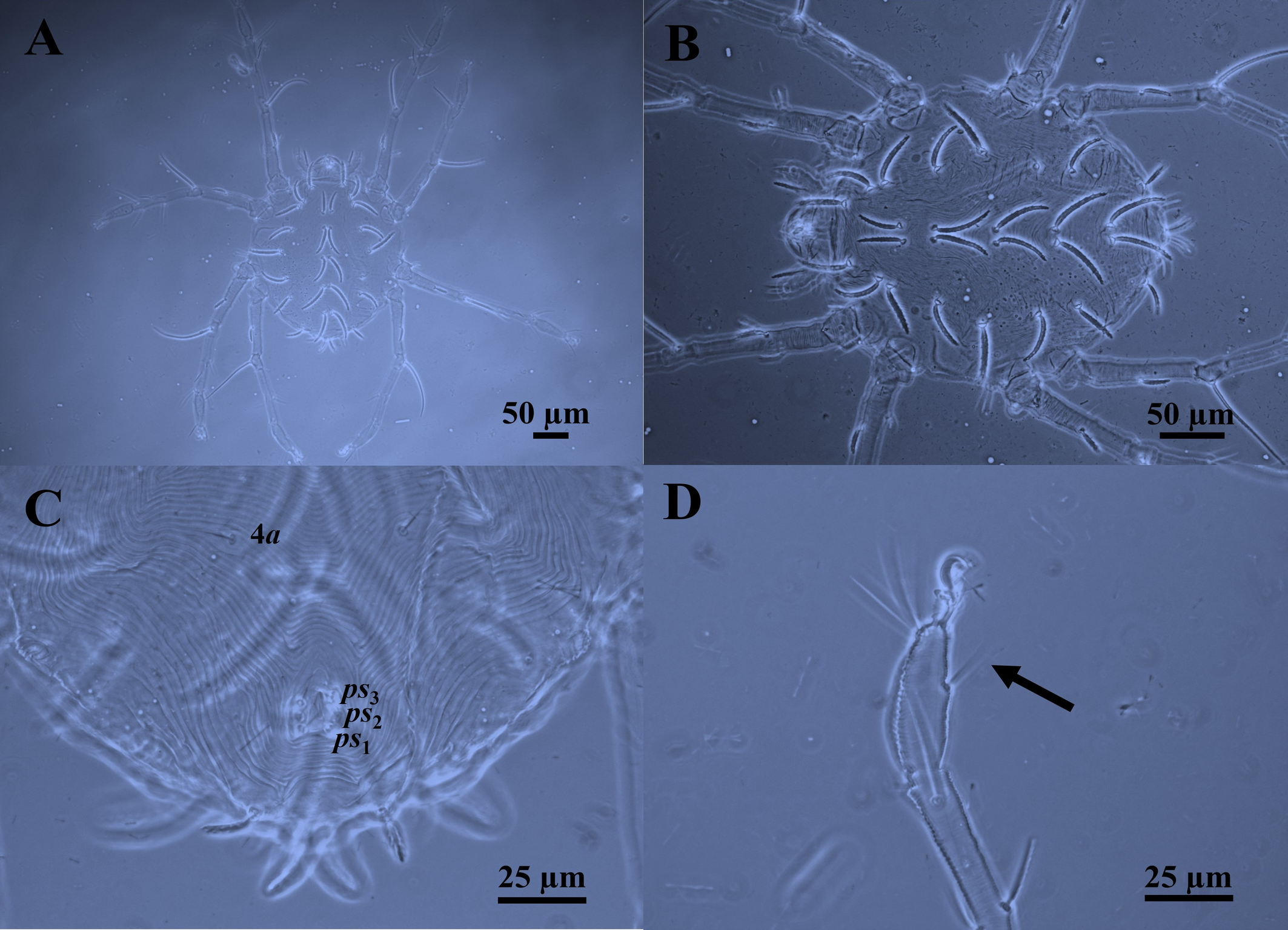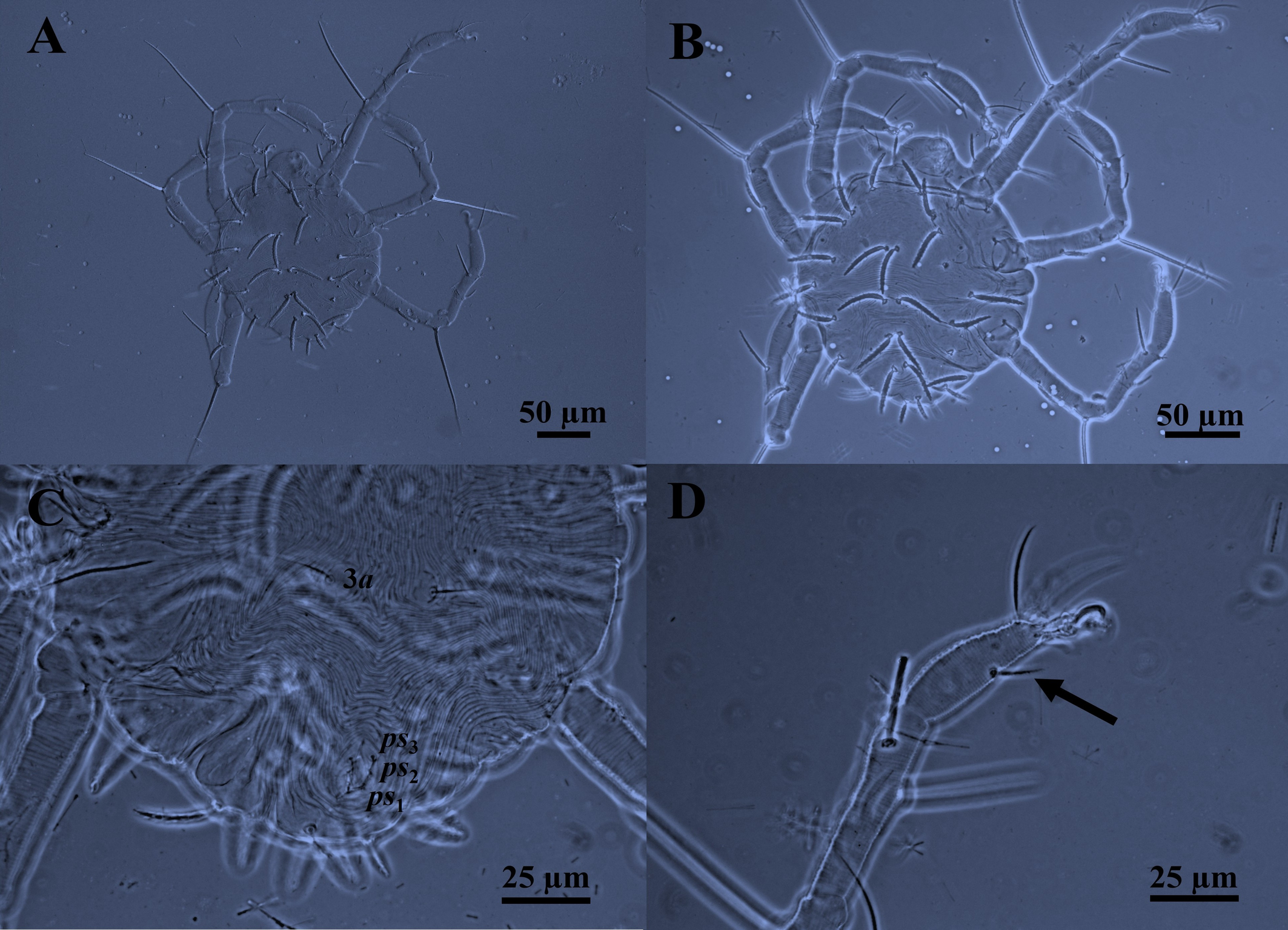Idiosomal Venter — Similar to the female in having three pairs of pseudanal setae ps1-3, but without ag and g setae (Fig. 4C). Lengths of ventral setae: 1a 15, 3a 20, 4a 14, ps1-3 6. Distances between ventral idiosomal setae: 1a–1a 85, 3a–3a 37, 4a–4a 46.