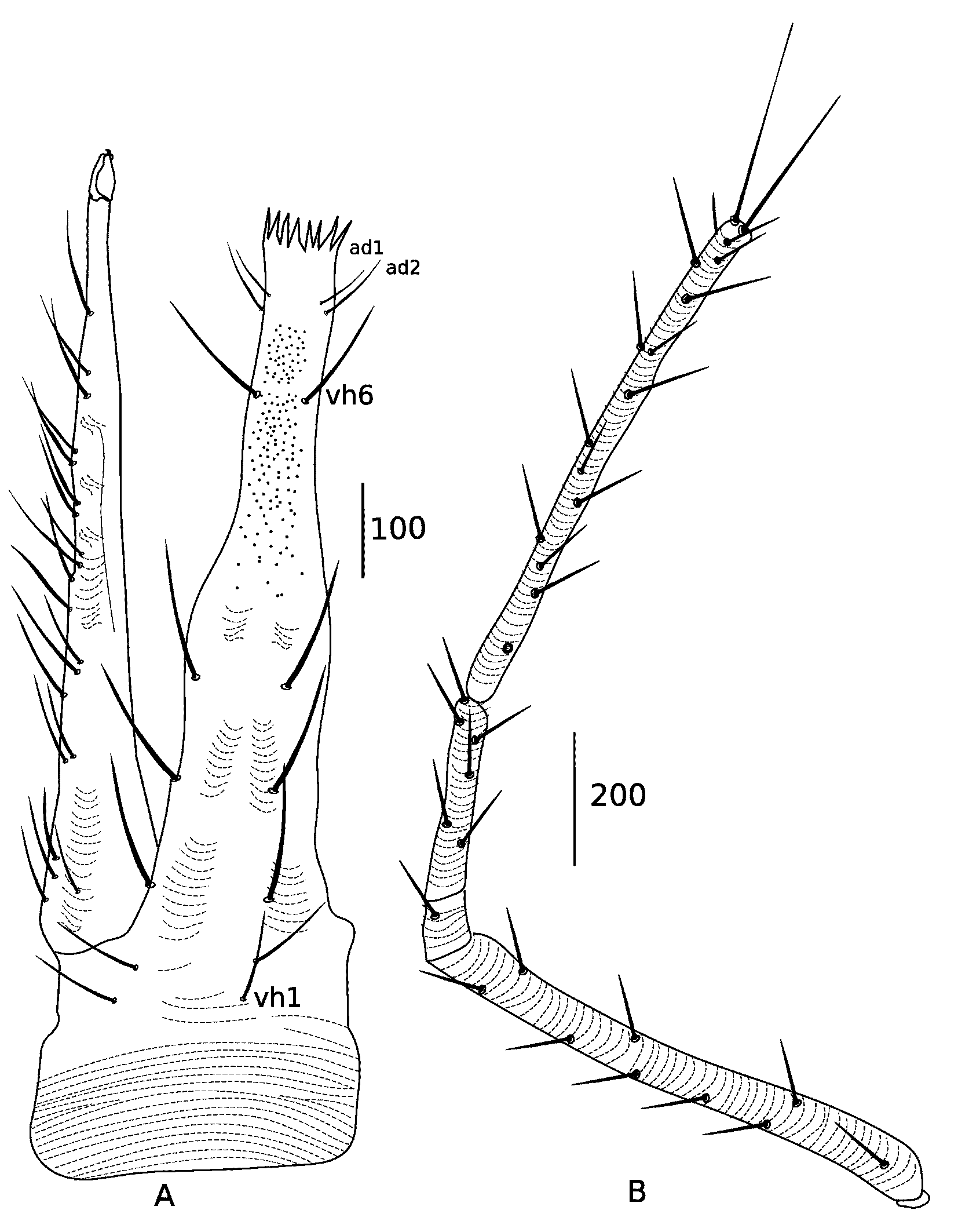 Gnathosoma ― (Figure 5 A and B). Subcapitulum with transverse and broken striae, 414 (414–480) long, width at base 142 (138–194), with six pairs of ventral setae (vh1–6); distal pair 92 (92–100) and proximal pair 57 (42–51); two pairs of short adoral setae ad1 23 (22–24) and ad2 18 (18–20); dorsal hypostomal setae (DHS) absent. Chelicerae 500 (470–495) long and 110 (92–114) wide, with 20 (20) [22 setae on right chelicera of the holotype, Figure 5A], proximal seta 66 (46–60) and distal seta 103 (92); movable and fixed digits each with one tooth; striation broken. Palp segments were illustrated from a paratype as tibiotarsus missing in the holotype. Palp trochanter nude, palp basifemur with 10 (10) setae [11 setae on the left basifemur in a paratype, Figure 5B], palp telofemur with one seta, palp genu with four setae; tibiotarsus with 14 setae: 11sts, one terminal solenidion and two long terminal setae, des 265 and ves 196; measurements of palp segments as follows: trochanter 28 (28–30), basifemur 368 (368–400), telofemur 48 (53–57), genu 82 (80), tibiotarsus broken (368–373); genua 1.4–1.7 the length of telofemora.