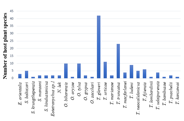 Other new host records made in the study are: red amaranth (Amaranthus cruentus), okra, (Abelmoschus esculentus), Mexican lilac (Gliricidia sepium) and bilimbi (Averrhoa bilimbi) for Oligonychus biharensis; red amaranth (A. cruentus) and bleeding heart vine (Clerodendrum thomsoniae) for T. puschelii; Malabar kino (Pterocarpus marsupium) and horsewood (Clausena anisata) for T. neocalidonychus; banana (Musa paradisiaca) and jaggery palm (Caryota urens) for Tetranychus fijiensis; winged bean (Psophocarpus tetragonolobus) for T. ludeni and cassava (Manihot esculenta) for E. orientalis.