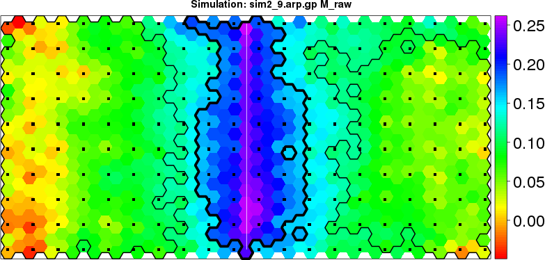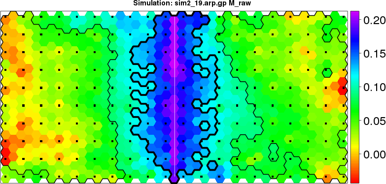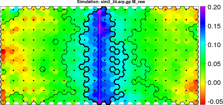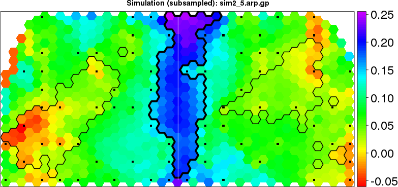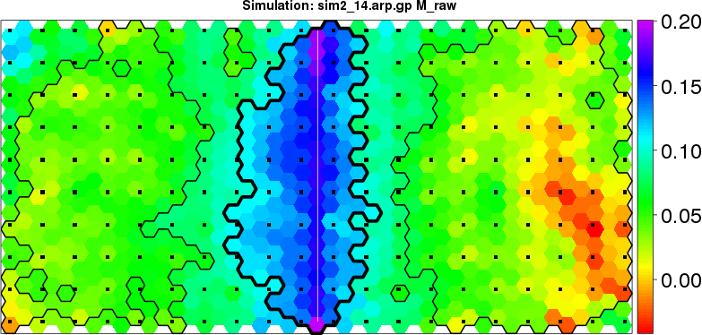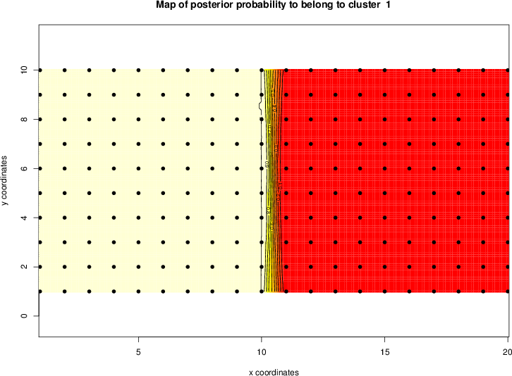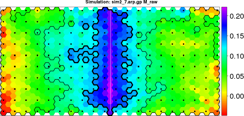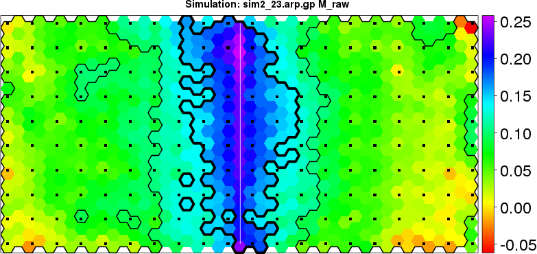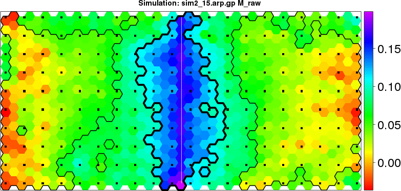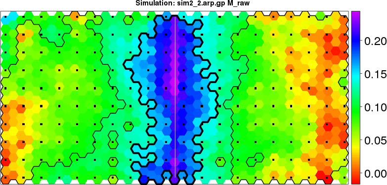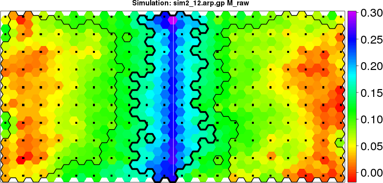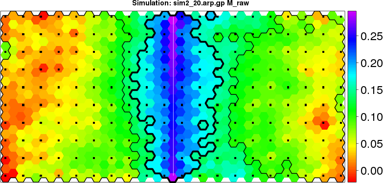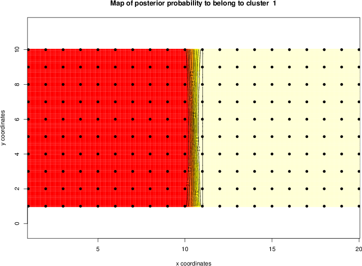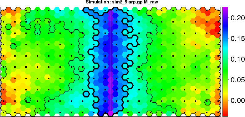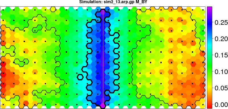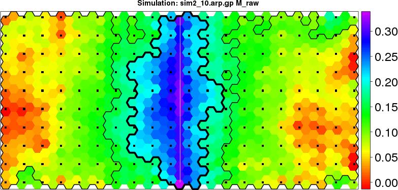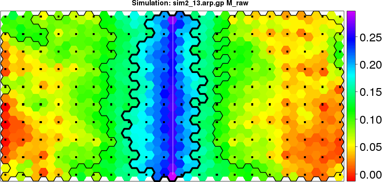 | Simulated data | Geographical plots of weighted mean of all ellipse values (i.e., individual genetic distances ar of Rousset 2000) and significant barrier (cells with differentiation values higher than expected under a random distribution (no FDR applied) are materialized with thick black borders) | Idem, Benjamini-Yekutieli FDR applied | MAPI analysis (no FDR applied) with subsampled (75/200) dataset | MAPI analysis (Benjamini-Yekutieli FDR applied) with subsampled (75/200) dataset | Best probability memberships | Probability memberships for cluster 1 | Probability memberships for cluster 2 | Probability memberships for cluster 3 | Probability memberships for cluster 4 | Probability memberships for cluster 5 | Best probability memberships | Probability memberships for cluster 1 | Probability memberships for cluster 2 | Probability memberships for cluster 3 | Probability memberships for cluster 4 | Probability memberships for cluster 5 | Scatter plot showing the first two components of the DAPC (when K*>2) or density plot showing the first principal component of the DAPC (when K*=2) | Probability memberships for cluster 1 | Probability memberships for cluster 2 | Probability memberships for cluster 3 | Probability memberships for cluster 4 | Probability memberships for cluster 5 | Scatter plot showing the first two components of the DAPC (when K*>2) or density plot showing the first principal component of the DAPC (when K*=2) | Probability memberships for cluster 1 | Probability memberships for cluster 2 | Probability memberships for cluster 3 | Probability memberships for cluster 4 | Probability memberships for cluster 5 |